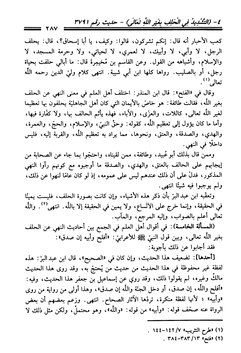 وقال في "الفتح": قال ابن المنذر: اختلف أهل العلم في معنى النهي عن الحلف بغير اللَّه، فقالت طائفة: هو خاصّ بالأيمان التي كان أهل الجاهليّة يحلفون بها تعظيما لغير اللَّه تعالى، كاللات، والعزّى، والآباء، فهذه يأثم الحالف بها, ولا كفّارة فيها، وأما ما كان يؤول إلى تعظيم اللَّه، كقوله: وحقِّ النبيّ، والإسلام، والحجّ، والعمرة، والهدي، والصدقة، والعتق، ونحوها، مما يراد به تعظيم اللَّه، والقربة إليه، فليس داخلاً في النهي.