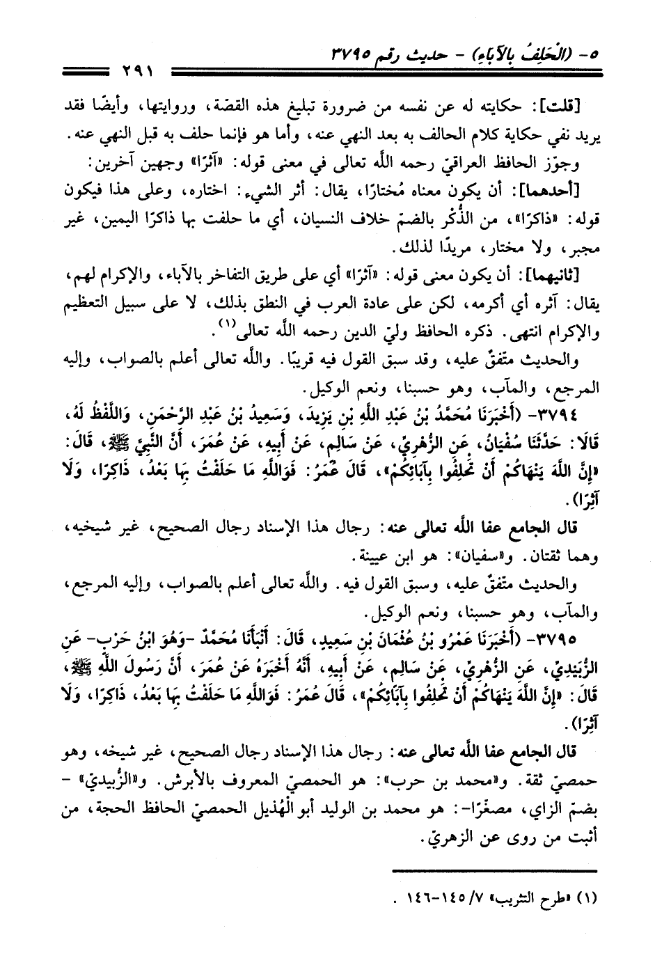 3794 - (أَخْبَرَنَا مُحَمَّدُ بْنُ عَبْدِ اللَّهِ بْنِ يَزِيدَ، وَسَعِيدُ بْنُ عَبْدِ الرَّحْمَنِ, وَاللَّفْظُ لَهُ, قَالَا: حَدَّثَنَا سُفْيَانُ، عَنْ الزُّهْرِيِّ، عَنْ سَالِمٍ، عَنْ أَبِيهِ، عَنْ عُمَرَ، أَنَّ النَّبِيَّ - صَلَّى اللَّهُ عَلَيْهِ وَسَلَّمَ - قَالَ: "إِنَّ اللَّهَ يَنْهَاكُمْ أَنْ تَحْلِفُوا بِآبَائِكُمْ", قَالَ عُمَرُ: فَوَاللَّهِ مَا حَلَفْتُ بِهَا بَعْدُ, ذَاكِرًا, وَلَا آثِرًا).