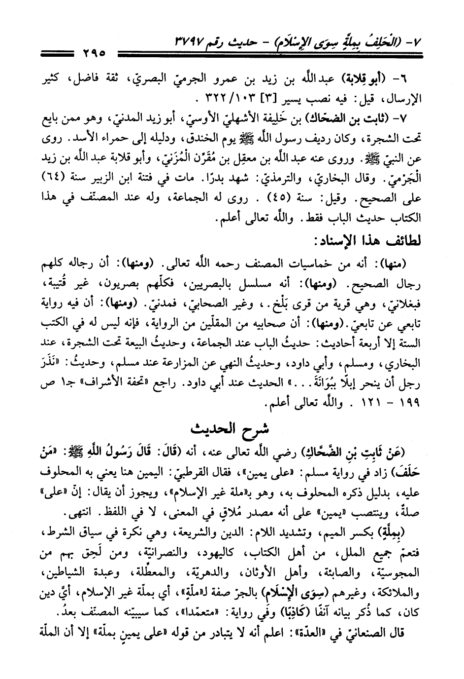 (عَنْ ثَابِتِ بْنِ الضَّحَّاكِ) - رضي اللَّه تعالى عنه -، أنه (قَالَ: قَالَ رَسُولُ اللَّهِ - صلى اللَّه عليه وسلم -: "مَنْ حَلَفَ) زاد في رواية مسلم: "على يمين"، فقال القرطبيّ: اليمين هنا يعني به المحلوف عليه، بدليل ذكره المحلوف به، وهو بـ "ملة غير الإسلام"، ويجوز أن يقال: إنّ "على" صلةٌ، وينتصب "يمين" على أنه مصدر مُلاقٍ في المعنى، لا في اللفظ. انتهى.