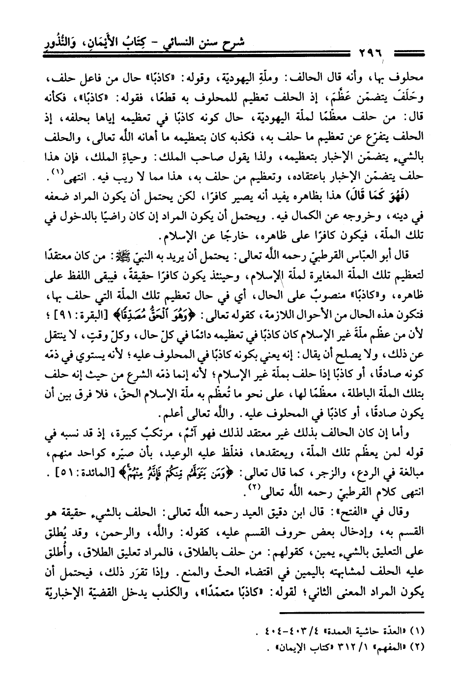 وأما إن كان الحالف بذلك غير معتقد لذلك فهو آثمٌ، مرتكبٌ كبيرة، إذ قد نسبه في قوله لمن يعظّم تلك الملّة، ويعتقدها، فغلّظ عليه الوعيد، بأن صيّره كواحد منهم، مبالغة في الردع، والزجر، كما قال تعالى: {وَمَنْ يَتَوَلَّهُمْ مِنْكُمْ فَإِنَّهُ مِنْهُمْ} [المائدة: 51]. انتهى كلام القرطبيّ -رحمه اللَّه تعالى- (¬2).