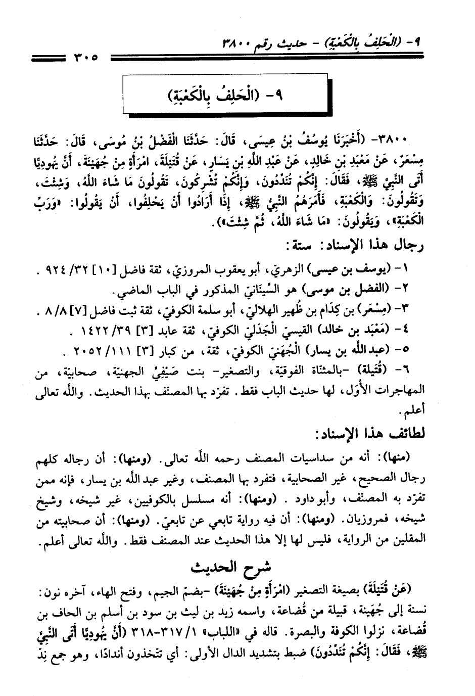 3800 - (أَخْبَرَنَا يُوسُفُ بْنُ عِيسَى، قَالَ: حَدَّثَنَا الْفَضْلُ بْنُ مُوسَى، قَالَ: حَدَّثَنَا مِسْعَرٌ، عَنْ مَعْبَدِ بْنِ خَالِدٍ، عَنْ عَبْدِ اللَّهِ بْنِ يَسَارٍ، عَنْ قُتَيْلَةَ، امْرَأَةٍ مِنْ جُهَيْنَةَ, أَنَّ يَهُودِيًّا أَتَى النَّبِيَّ - صَلَّى اللَّهُ عَلَيْهِ وَسَلَّمَ -, فَقَالَ: إِنَّكُمْ تُنَدِّدُونَ، وَإِنَّكُمْ تُشْرِكُونَ, تَقُولُونَ مَا شَاءَ, اللَّهُ, وَشِئْتَ، وَتَقُولُونَ: وَالْكَعْبَةِ، فَأَمَرَهُمُ النَّبِيُّ - صَلَّى اللَّهُ عَلَيْهِ وَسَلَّمَ - إِذَا أَرَادُوا أَنْ يَحْلِفُوا, أَنْ يَقُولُوا: "وَرَبِّ الْكَعْبَةِ"، وَيَقُولُونَ: "مَا شَاءَ اللَّهُ، ثُمَّ شِئْتَ").