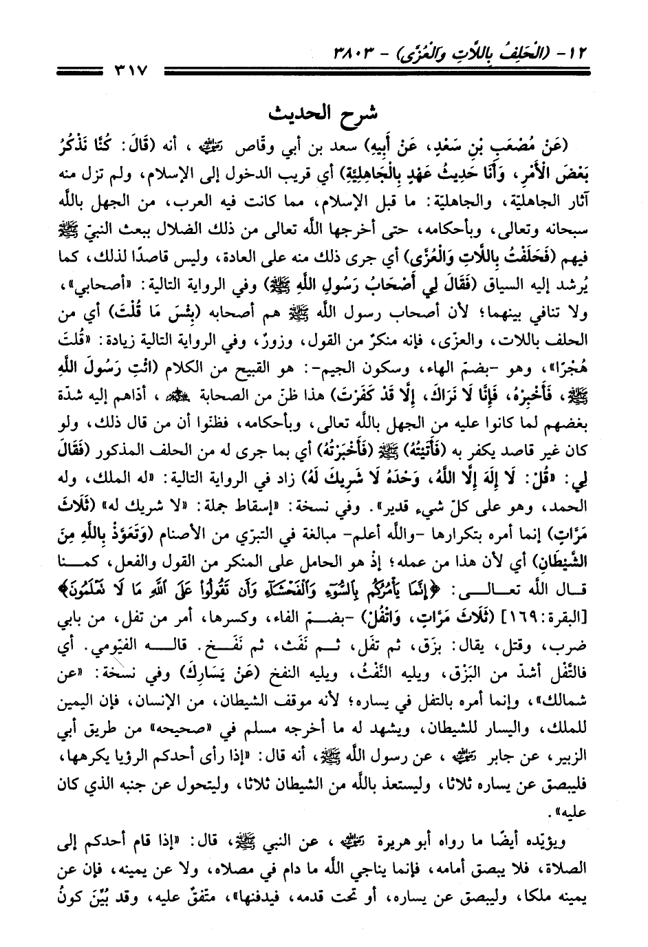 (عَنْ مُصْعَبِ بْنِ سَعْدٍ، عَنْ أَبِيهِ) سعد بن أبي وقّاص - رضي اللَّه عنه -، أنه (قَالَ: كُنَّا نَذْكُرُ بَعْضَ الْأَمْرِ, وَأَنَا حَدِيثُ عَهْدٍ بِالْجَاهِلِيَّةِ) أي قريب الدخول إلى الإسلام، ولم تزل منه آثار الجاهليّة، والجاهليّة: ما قبل الإسلام، مما كانت فيه العرب، من الجهل باللَّه سبحانه وتعالى، وبأحكامه، حتى أخرجها اللَّه تعالى من ذلك الضلال ببعث النبيّ - صلى اللَّه عليه وسلم - فيهم (فَحَلَفْتُ بِاللَّاتِ وَالْعُزَّى) أي جرى ذلك منه على العادة، وليس قاصدًا لذلك، كما يُرشد إليه السياَق (فَقَالَ لِي أَصْحَابُ رَسُولِ اللهِ - صلى اللَّه عليه وسلم -) وفي الرواية التالية: "أصحابي"، ولا تنافي بينهما؛ وإن أصحاب رسول اللَّه - صلى اللَّه عليه وسلم - هم أصحابه (بِئْسَ مَا قُلْتَ) أي من الحلف باللات، والعزّى، فإنه منكرٌ من القول، وزورٌ، وفي الرواية التالية زيادة: "قُلتَ هُجرًا"، وهو -بضمّ الهاء، وسكون الجيم-: هو القبيح من الكلام (ائْتِ رَسُولَ اللهِ - صَلَّى اللَّهُ عَلَيْهِ وَسَلَّمَ - فَأَخْبِرْهُ، فَإِنَّا لَا نَرَاكَ إِلَّا قَدْ كَفَرْتَ) هذا ظنّ من الصحابة - رضي اللَّه عنهم -، أدّاهم إليه شدّة بغضهم لما كانوا عليه من الجهل باللَّه تعالى، وبأحكامه، فظنّوا أن من قال ذلك، ولو كان غير قاصد يكفر به (فَأَتَيْتُهُ) - صلى اللَّه عليه وسلم - (فَأَخْبَرْتُهُ) أي بما جرى له من الحلف المذكور (فَقَالَ: لِي: " قُلْ: لَا إِلَهَ إِلَّا اللَّهُ وَحْدَهُ لَا شَرِيكَ لَهُ) زاد في الرواية التالية: "له الملك، وله الحمد، وهو على كلّ شيء قدير". وفي نسخة: (إسقاط جملة: "لا شريك له" (ثَلَاثَ مَرَّاتٍ) إنما أمره بتكرارها -واللَّه أعلم- مبالغة في التبرّي من الأصنام (وَتَعَوَّذْ بِاللَّهِ مِنَ الشَّيْطَانِ) أي لأن هذا من عمله؛ إذْ هو الحامل على المنكر من القول والفعل، كما قال اللَّه تعالى: {إِنَّمَا يَأْمُرُكُمْ بِالسُّوءِ وَالْفَحْشَاءِ وَأَنْ تَقُولُوا عَلَى اللَّهِ مَا لَا تَعْلَمُونَ} [البقرة: 169] (ثَلَاثَ مَرَّاتٍ، وَاتْفُلْ) -بضمّ الفاء، وكسرها، أمر من تفل، من بابي ضرب، وقتل، يقال: بزَق، ثم تفَل، ثم نَفَث، ثم نَفَخ. قاله الفيّومي. أي فالتَّفْل أشدّ من البَزْق، ويليه النَّفْثُ، ويليه النفخ (عَنْ يَسَارِكَ) وفي نسخة: "عن شمالك"، وإنما أمره بالتفل في يساره؛ لأنه موقف الشيطان، من الإنسان، فإن اليمين للملك، واليسار للشيطان، ويشهد له ما أخرجه مسلم في "صحيحه" من طريق أبي الزبير، عن جابر - رضي اللَّه عنه -، عن رسول اللَّه - صلى اللَّه عليه وسلم -، أنه قال: (إذا رأى أحدكم الرؤيا يكرهها، فليبصق عن يساره ثلاثا، وليستعذ باللَّه من الشيطان ثلاثا، وليتحول عن جنبه الذي كان عليه".