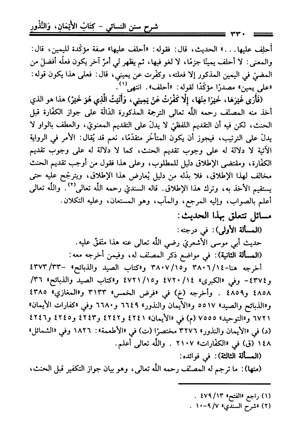 (فَأَرَى غَيْرَهَا خَيْرًا مِنْهَا، إِلَّا كَفَّرْتُ عَنْ يَمِينِي وَأَتَيْتُ الَّذِي هُوَ خَيْرٌ) هذا هو الذي أخذ منه المصنّف -رحمه اللَّه تعالى- الترجمة المذكورة الدّالة على جواز الكفّارة قبل الحنث، لكن فيه أن التقديم اللفظيّ لا يدلّ على التقديم المعنويّ، والعطف بالواو لا يدلّ على الترتيب، فيجوز أن يكون المتأخّر متقدّمًا، نعم قد يُقال: الأمر في الرواية الآتية لا دلالة له على وجوب تقديم الحنث، كما لا دلالة له على وجوب تقديم الكفّارة، ومقتضى الإطلاق دليل للمطلوب، وعلى هذا فقول من أوجب تقديم الحنث مخالف لهذا الإطلاق، فلا بدّ له من دليل يُعارض هذا الإطلاق، ويترجّح عليه حتى يستقيم الأخذ به، وترك هذا الإطلاق. قاله السنديّ -رحمه اللَّه تعالى- (¬2). واللَّه تعالى أعلم بالصواب، وإليه المرجع، والمآب، وهو المستعان، وعليه التكلان.