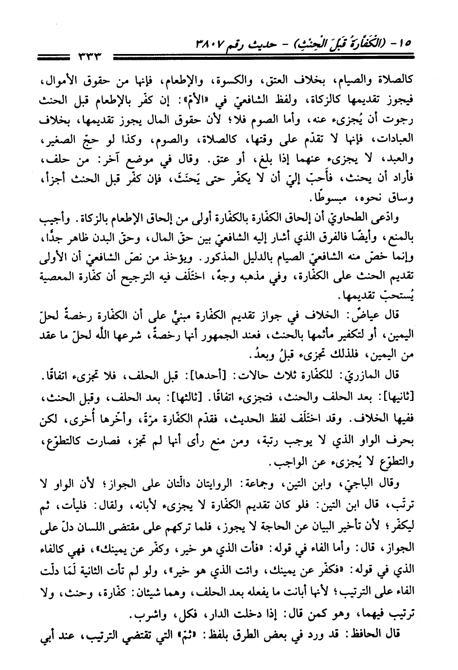 وادّعى الطحاويّ أن إلحاق الكفّارة بالكفّارة أولى من إلحاق الإطعام بالزكاة. وأجيب بالمنع، وأيضًا فالفرق الذي أشار إليه الشافعيّ بين حقّ المال، وحقّ البدن ظاهر جدًّا، وإنما خصّ منه الشافعيّ الصيام بالدليل المذكور. ويؤخذ من نصّ الشافعيّ أن الأولى تقديم الحنث على الكفّارة، وفي مذهبه وجهٌ، اختَلَف فيه الترجيح أن كفّارة المعصية يُستحبّ تقديمها.