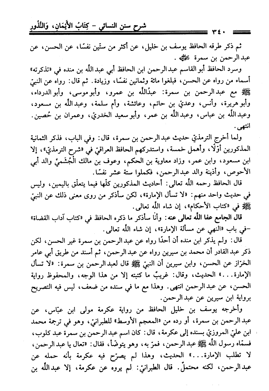 قال: ولم يذكر ابن منده أن أحدًا رواه عن عبد الرحمن بن سمرة غير الحسن، لكن ذكر عبد القادر أن محمد بن سيرين رواه عن عبد الرحمن، ثم أسند من طريق أبي عامر الخرّاز عن الحسن، وابن سيرين أن النبيّ - صلى اللَّه عليه وسلم - قال لعبد الرحمن بن سمرة: "لا تسأل الإمارة ... " الحديث، وقال: غريبٌ ما كتبته إلا من هذا الوجه، والمحفوظ رواية الحسن، عن عبد الرحمن انتهى. وهذا مع ما في سنده من ضعف، ليس فيه التصريح برواية ابن سيرين عن عبد الرحمن.