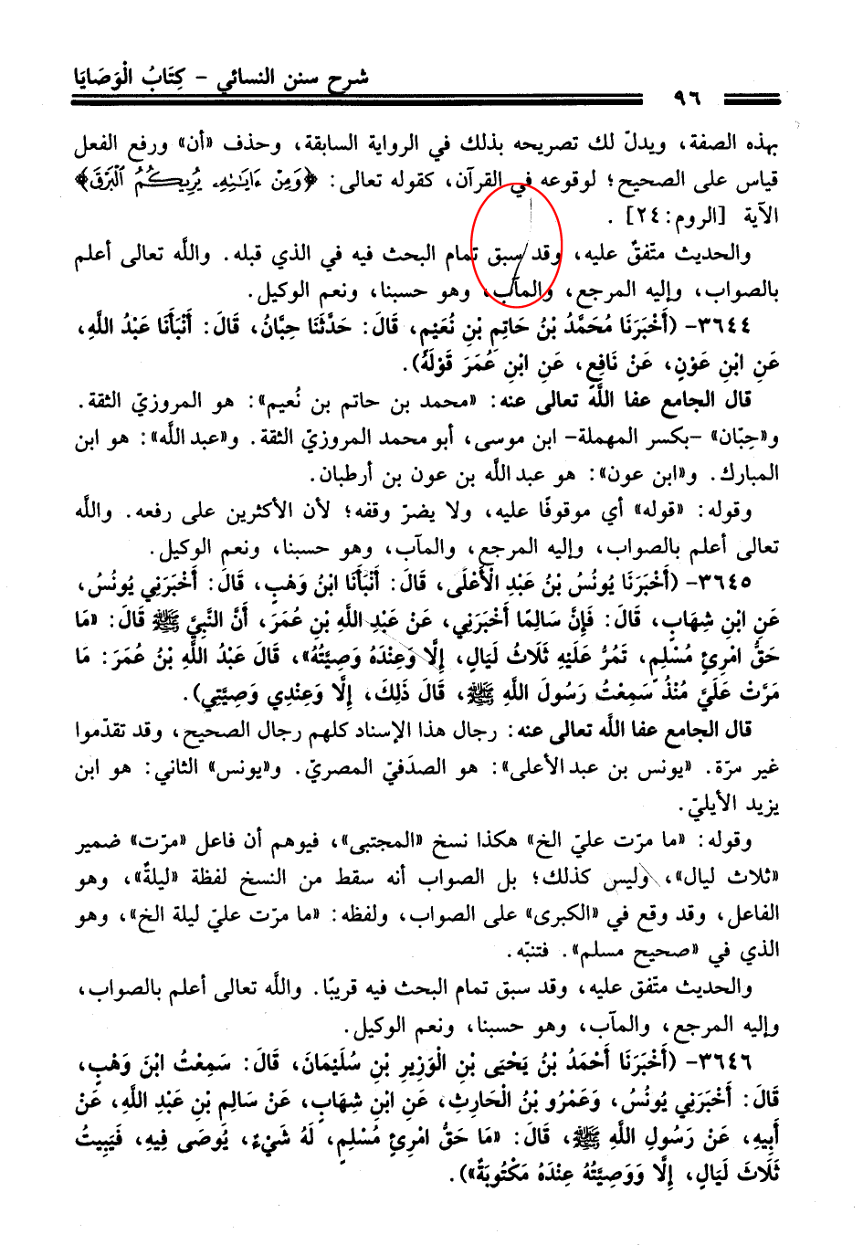 3646 - (أَخْبَرَنَا أَحْمَدُ بْنُ يَحْيَى بْنِ الْوَزِيرِ بْنِ سُلَيْمَانَ, قَالَ: سَمِعْتُ ابْنَ وَهْبٍ, قَالَ: أَخْبَرَنِي يُونُسُ, وَعَمْرُو بْنُ الْحَارِثِ, عَنِ ابْنِ شِهَابٍ, عَنْ سَالِمِ بْنِ عَبْدِ اللَّهِ, عَنْ أَبِيهِ, عَنْ رَسُولِ اللهِ - صلى اللَّه عليه وسلم - قَالَ: «مَا حَقُّ امْرِئٍ مُسْلِمٍ, لَهُ شَيْءٌ, يُوصَى فِيهِ, فَيَبِيتُ ثَلاَثَ لَيَالٍ, إِلاَّ وَوَصِيَّتُهُ عِنْدَهُ مَكْتُوبَةٌ»).