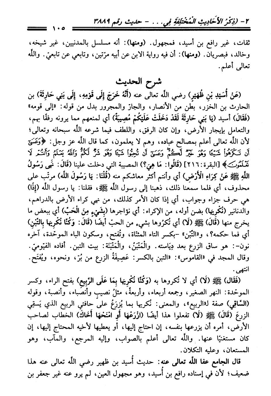 قال الجامع - عفا اللَّه تعالى عنه -: حديث أُسيد بن ظهير - رضي اللَّه تعالى عنه - هذا ضعيف؛ لأن في إسناده رافع بن أُسيد، وهو مجهول العين، لم يرو عنه غير جعفر بن