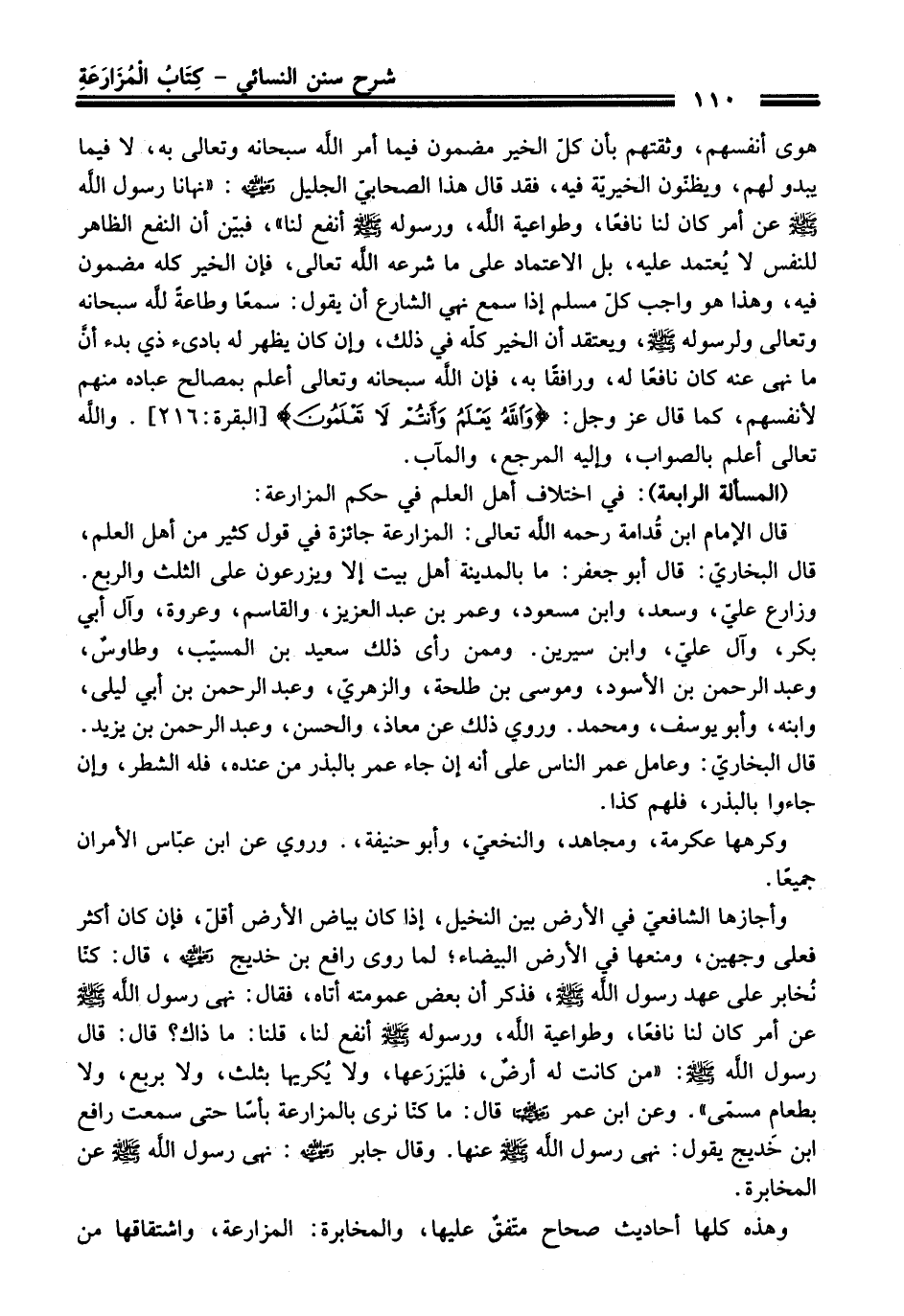 قال الإمام ابن قُدامة -رحمه اللَّه تعالى-: المزارعة جائزة في قول كثير من أهل العلم، قال البخاريّ: قال أبو جعفر: ما بالمدينة أهل بيت إلا ويزرعون على الثلث والربع. وزارع عليّ، وسعد، وابن مسعود، وعمر بن عبد العزيز، والقاسم، وعروة، وآل أبي بكر، وآل عليّ، وابن سيرين. وممن رأى ذلك سعيد بن المسيّب، وطاوسٌ، وعبد الرحمن بن الأسود، وموسى بن طلحة، والزهريّ، وعبد الرحمن بن أبي ليلى، وابنه، وأبو يوسف، ومحمد. وروي ذلك عن معاذ، والحسن، وعبد الرحمن بن يزيد. قال البخاريّ: وعامل عمر الناس على أنه إن جاء عمر بالبذر من عنده، فله الشطر، وإن جاءوا بالبذر، فلهم كذا.