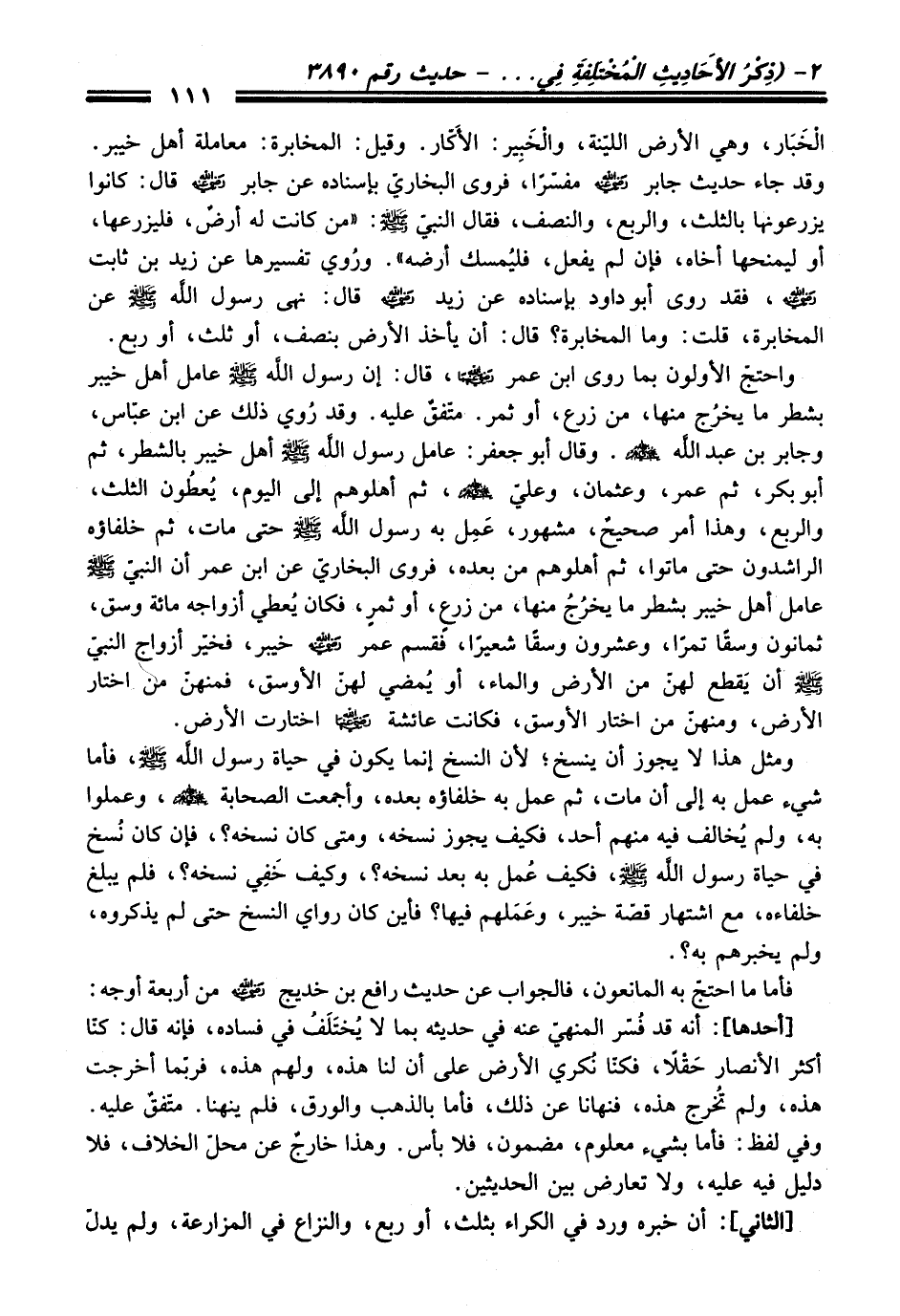 واحتجّ الأولون بما روى ابن عمر - رضي اللَّه عنهما - قال: إن رسول اللَّه - صلى اللَّه عليه وسلم - عامل أهل خيبر بشطر ما يخرُج منها، من زرع، أو ثمر. متّفقٌ عليه. وقد رُوي ذلك عن ابن عبّاس، وجابر بن عبد اللَّه - رضي اللَّه عنهم -. وقال أبو جعفر: عامل رسول اللَّه - صلى اللَّه عليه وسلم - أهل خيبر بالشطر، ثم أبو بكر، ثم عمر، وعثمان، وعلي - رضي اللَّه عنهم -، ثم أهلوهم إلى اليوم، يُعطُون الثلث، والربع، وهذا أمر صحيحٌ، مشهور، عَمِل به رسول اللَّه - صلى اللَّه عليه وسلم - حتى مات، ثم خلفاؤه الراشدون حتى ماتوا، ثم أهلوهم من بعده، فروى البخاريّ عن ابن عمر أن النبيّ - صلى اللَّه عليه وسلم - عامل أهل خيبر بشطر ما يخرُجُ منها، من زرع، أو ثمرٍ، فكان يُعطي أزواجه مائة وسق، ثمانون وسقًا تمرًا، وعشرون وسقًا شعيرًا، فقسم عمر - رضي اللَّه عنه - خيبر، فخيّر أزواج النبيّ - صلى اللَّه عليه وسلم - أن يَقطع لهنّ من الأرض والماء، أو يُمضي لهنّ الأوسق، فمنهنّ مقلًا اختار الأرض، ومنهنّ من اختار الأوسق، فكانت عائشة - رضي اللَّه عنها - اختارت الأرض.