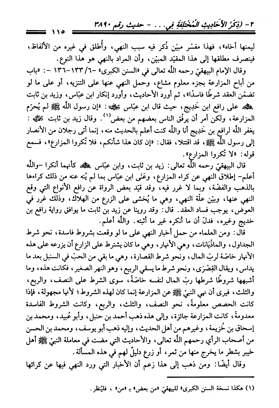 وقال الإمام البيهقيّ -رحمه اللَّه تعالى- في "السنن الكبرى" -6/ 133 - 136 - : "باب من أباح المزارعة بجزء معلوم مشاع، وحمل النهي عنها على التنزيه، أو على ما لو تضمّن العقد شرطًا فاسدًا"، ثم أورد الأحاديث، وأورد إنكار ابن عبّاس، وزيد بن ثابت - رضي اللَّه عنهم - على رافع ابن خَدِيج، حيث قال ابن عبّاس - رضي اللَّه عنهما -: "إن رسول اللَّه - صلى اللَّه عليه وسلم - لم يُحرّم المزارعة، ولكن أمر أن يرفُق الناس بعضهم من بعض (¬1). وقال زيد بن ثابت - رضي اللَّه عنه -: يغفر اللَّه لرافع بن خَدِيج أنا واللَّه كنت أعلم بالحديث منه، إنما أتى رجلان من الأنصار إلى رسول اللَّه - صلى اللَّه عليه وسلم -، قد اقتتلا، فقال: "إن كان هذا شأنكم، فلا تُكروا المزارع"، فسمع قوله: "لا تُكروا المزارع".