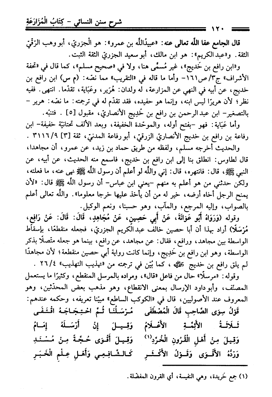 و"ابن رافع بن خَديج"، غير مُسمَّى هنا, ولا في "صحيح مسلم"، كما قال في "تحفة الأشراف" ج 3/ ص 161 - وأما ما قاله في "التقريب" مما نصّه: (م س) ابن رافع بن خديج، عن أبيه في النهي عن المزارعة، له ولدان: هُرَير، وعَبَاية، تقدّما. انتهى. ففيه نظر؛ لأن هريرًا ليس ابنه، وإنما هو حفيده، فقد تقدّم له في ترجمته: ما نصّه: هرير -بالتصغير- ابن عبد الرحمن بن رافع بن خدِيج الأنصاريّ، مقبول [5]. فتنبّه.