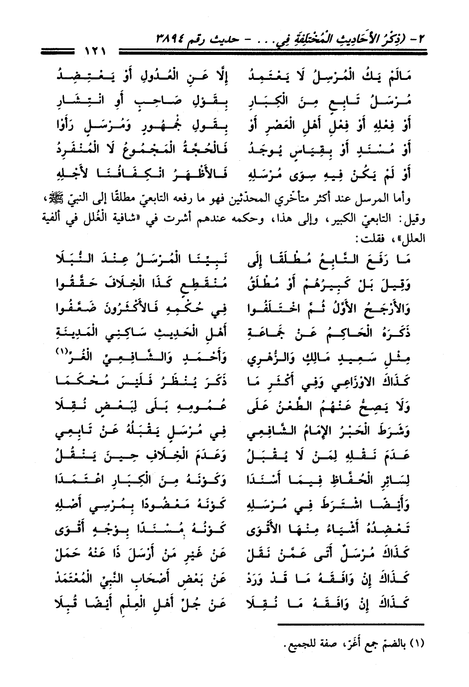 وأما المرسل عند أكثر متأخّري المحدّثين فهو ما رفعه التابعيّ مطلقًا إلى النبيّ - صلى اللَّه عليه وسلم -، وقيل: التابعيّ الكبير، وإلى هذا، وحكمه عندهم أشرت في "شافية الْغُلل في ألفية العلل"، فقلت: