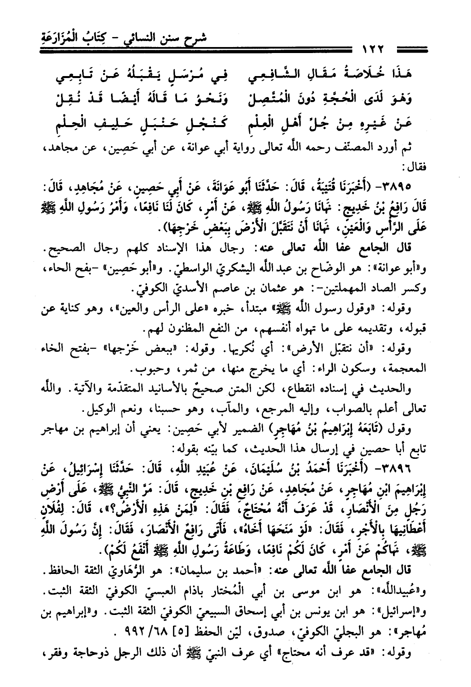 3895 - (أَخْبَرَنَا قُتَيْبَةُ, قَالَ: حَدَّثَنَا أَبُو عَوَانَةَ, عَنْ أَبِي حَصِينٍ, عَنْ مُجَاهِدٍ, قَالَ: قَالَ رَافِعُ بْنُ خَدِيجٍ: نَهَانَا رَسُولُ اللَّهِ - صلى اللَّه عليه وسلم -, عَنْ أَمْرٍ, كَانَ لَنَا نَافِعًا, وَأَمْرُ رَسُولِ اللَّهِ - صلى اللَّه عليه وسلم - عَلَى الرَّأْسِ وَالْعَيْنِ, نَهَانَا أَنْ نَتَقَبَّلَ الأَرْضَ بِبَعْضِ خَرْجِهَا).