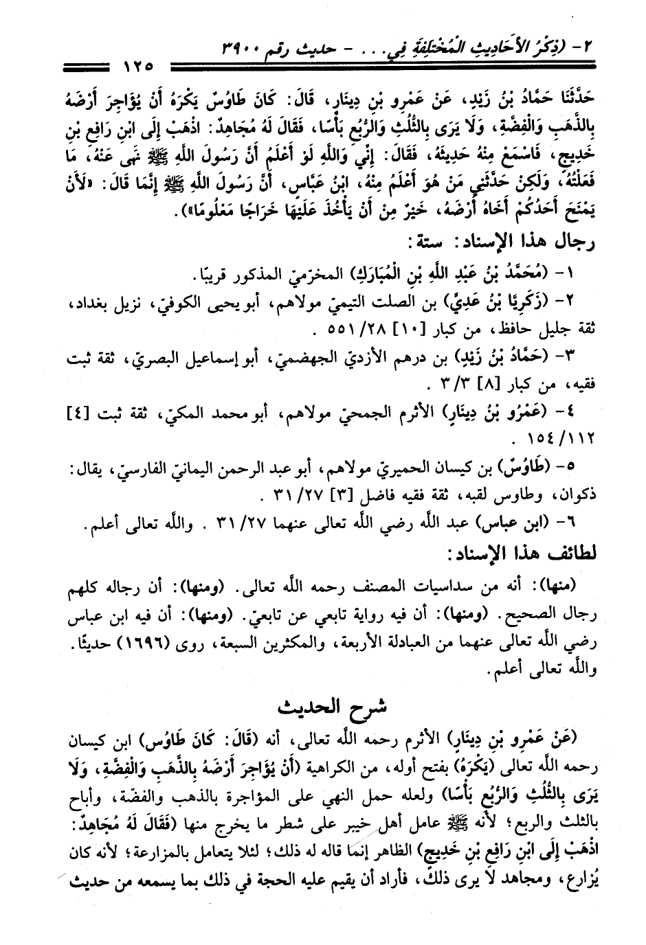 حَدَّثَنَا حَمَّادُ بْنُ زَيْدٍ, عَنْ عَمْرِو بْنِ دِينَارٍ, قَالَ: كَانَ طَاوُسٌ يَكْرَهُ أَنْ يُؤَاجِرَ أَرْضَهُ بِالذَّهَبِ وَالْفِضَّةِ, وَلاَ يَرَى بِالثُّلُثِ وَالرُّبُعِ بَأْسًا, فَقَالَ لَهُ مُجَاهِدٌ: اذْهَبْ إِلَى ابْنِ رَافِعِ بْنِ خَدِيجٍ, فَاسْمَعْ مِنْهُ حَدِيثَهُ, فَقَالَ: إِنِّي وَاللَّهِ لَوْ أَعْلَمُ أَنَّ رَسُولَ اللَّهِ - صلى اللَّه عليه وسلم - نَهَى عَنْهُ, مَا فَعَلْتُهُ, وَلَكِنْ حَدَّثَنِي مَنْ هُوَ أَعْلَمُ مِنْهُ, ابْنُ عَبَّاسٍ, أَنَّ رَسُولَ اللَّهِ - صلى اللَّه عليه وسلم - إِنَّمَا قَالَ: «لأَنْ يَمْنَحَ أَحَدُكُمْ أَخَاهُ أَرْضَهُ, خَيْرٌ مِنْ أَنْ يَأْخُذَ عَلَيْهَا خَرَاجًا مَعْلُومًا».