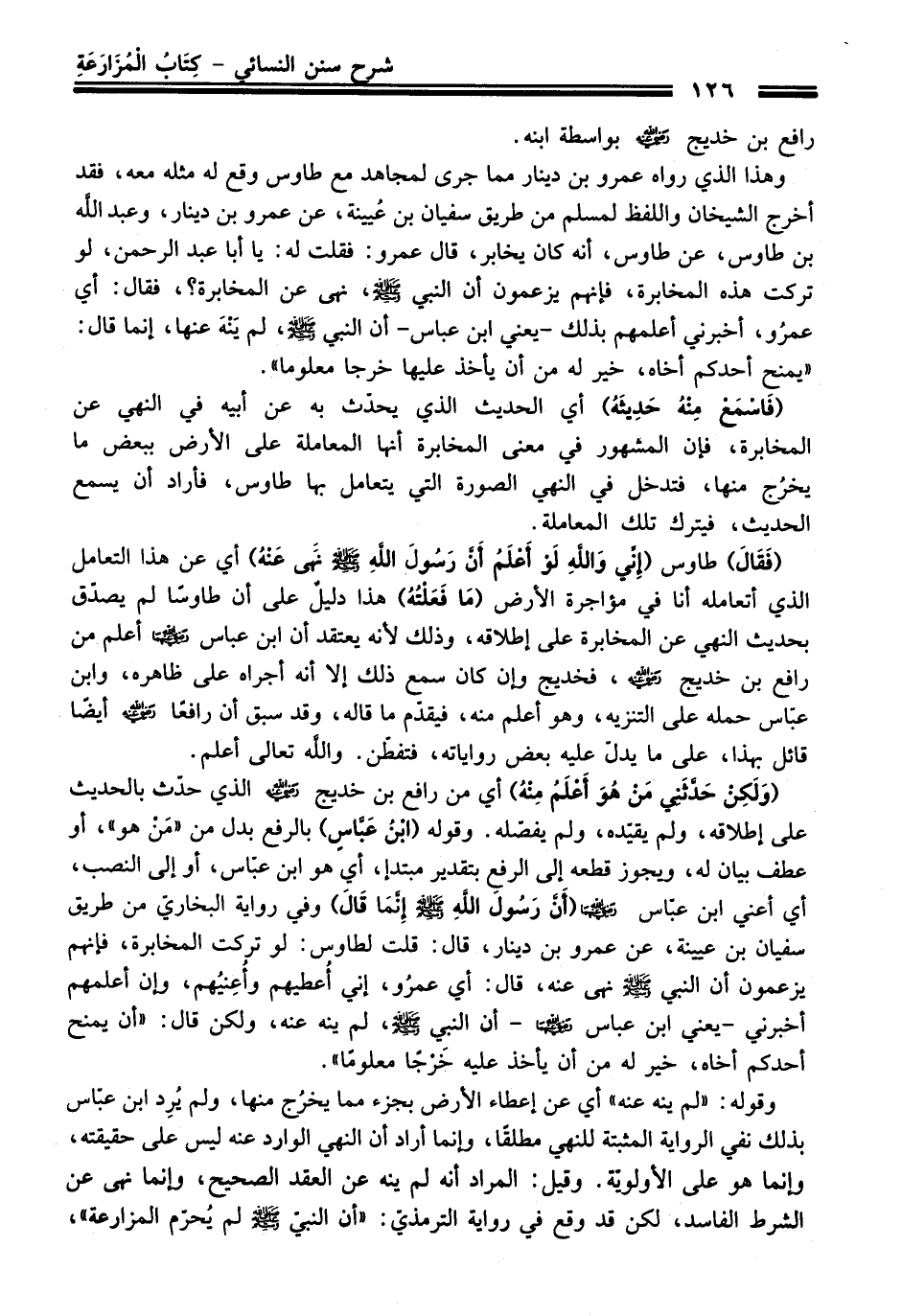 وهذا الذي رواه عمرو بن دينار مما جرى لمجاهد مع طاوس وقع له مثله معه، فقد أخرج الشيخان واللفظ لمسلم من طريق سفيان بن عُيينة، عن عمرو بن دينار، وعبد اللَّه بن طاوس، عن طاوس، أنه كان يخابر، قال عمرو: فقلت له: يا أبا عبد الرحمن، لو تركت هذه المخابرة، فإنهم يزعمون أن النبيّ - صلى اللَّه عليه وسلم -، نهى عن المخابرة؟، فقال: أي عمرُو، أخبرني أعلمهم بذلك -يعني ابن عبّاس- أن النبيّ - صلى اللَّه عليه وسلم -، لم يَنْهَ عنها، إنما قال: "يمنح أحدكم أخاه، خير له من أن يأخذ عليها خرجا معلوما".