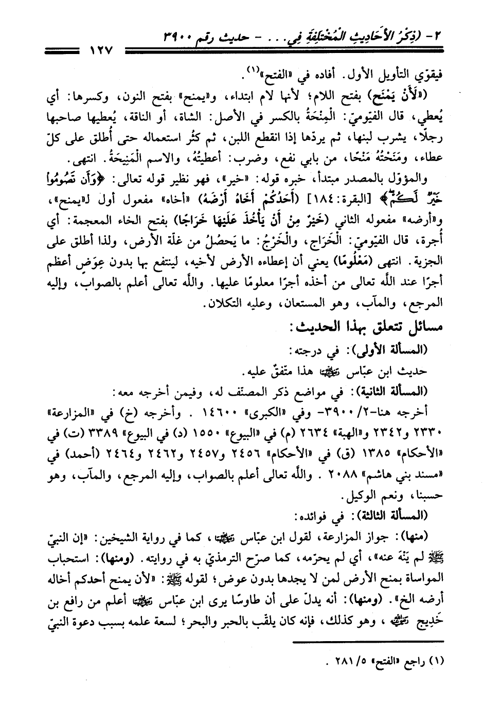 (منها): جواز المزارعة، لقول ابن عبّاس - رضي اللَّه عنهما -، كما في رواية الشيخين: "إن النبيّ - صلى اللَّه عليه وسلم - لم يَنْهَ عنه"، أي لم يحرّمه، كما صرّح الترمذيّ به في روايته. (ومنها): استحباب المواساة بمنح الأرض لمن لا يجدها بدون عوض؛ لقوله - صلى اللَّه عليه وسلم -: "لأن يمنح أحدكم أخا له أرضه الخ". (ومنها): أنه يدلّ على أن طاوسًا يرى ابن عبّاس - رضي اللَّه عنهما - أعلم من رافع بن خَدِيج - رضي اللَّه عنه -، وهو كذلك، فإنه كان يلقّب بالحبر والبحر؛ لسعة علمه بسبب دعوة النبيّ