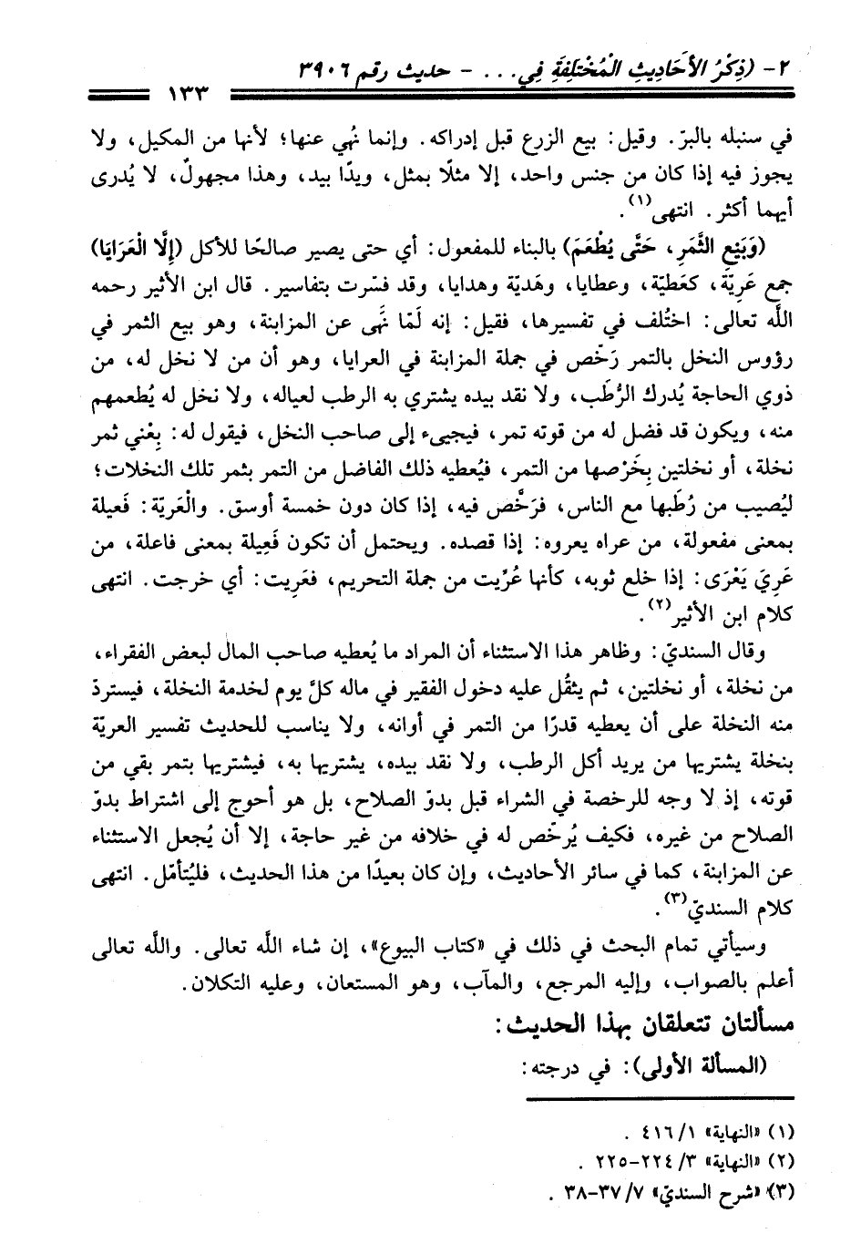 وقال السنديّ: وظاهر هذا الاستثناء أن المراد ما يُعطيه صاحب المال لبعض الفقراء، من نخلة، أو نخلتين، ثم يثقُل عليه دخول الفقير في ماله كلّ يوم لخدمة النخلة، فيستردّ منه النخلة على أن يعطيه قدرًا من التمر في أوانه، ولا يناسب للحديث تفسير العريّة بنخلة يشتريها من يريد أكل الرطب، ولا نقد بيده، يشتريها به، فيشتريها بتمر بقي من قوته، إذ لا وجه للرخصة في الشراء قبل بدوّ الصلاح، بل هو أحوج إلى اشتراط بدوّ الصلاح من غيره، فكيف يُرخّص له في خلافه من غير حاجة، إلا أن يُجعل الاستثناء عن المزابنة، كما في سائر الأحاديث، وإن كان بعيدًا من هذا الحديث، فليُتأمّل. انتهى كلام السنديّ (¬3).