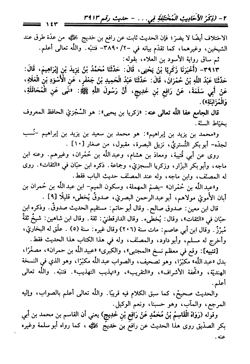 3913 - (أَخْبَرَنَا زَكَرِيَّا بْنُ يَحْيَى, قَالَ: حَدَّثَنَا مُحَمَّدُ بْنُ يَزِيدَ بْنِ إِبْرَاهِيمَ, قَالَ: حَدَّثَنَا عَبْدُ اللَّهِ بْنُ حُمْرَانَ, قَالَ: حَدَّثَنَا عَبْدُ الْحَمِيدِ بْنُ جَعْفَرٍ, عَنِ الأَسْوَدِ بْنِ الْعَلاَءِ, عَنْ أَبِي سَلَمَةَ, عَنْ رَافِعِ بْنِ خَدِيجٍ, أَنَّ رَسُولَ اللَّهِ - صلى اللَّه عليه وسلم - نَهَى عَنِ الْمُحَاقَلَةِ, وَالْمُزَابَنَةِ).
