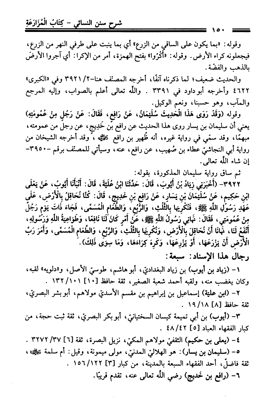 3922 - (أَخْبَرَنِي زِيَادُ بْنُ أَيُّوبَ, قَالَ: حَدَّثَنَا ابْنُ عُلَيَّةَ, قَالَ: أَنْبَأَنَا أَيُّوبُ, عَنْ يَعْلَى بْنِ حَكِيمٍ, عَنْ سُلَيْمَانَ بْنِ يَسَارٍ, عَنْ رَافِعِ بْنِ خَدِيجٍ, قَالَ: كُنَّا نُحَاقِلُ بِالأَرْضِ, عَلَى عَهْدِ رَسُولِ اللَّهِ - صلى اللَّه عليه وسلم -, فَنُكْرِيهَا بِالثُّلُثِ, وَالرُّبُعِ, وَالطَّعَامِ الْمُسَمَّى, فَجَاءَ ذَاتَ يَوْمٍ رَجُلٌ مِنْ عُمُومَتِىي, فَقَالَ: نَهَانِى رَسُولُ اللَّهِ - صلى اللَّه عليه وسلم -, عَنْ أَمْرٍ كَانَ لَنَا نَافِعًا, وَطَوَاعِيَةُ اللَّهِ وَرَسُولِهِ, أَنْفَعُ لَنَا, نَهَانَا أَنْ نُحَاقِلَ بِالأَرْضِ, وَنُكْرِيَهَا بِالثُّلُثِ, وَالرُّبُعِ, وَالطَّعَامِ الْمُسَمَّى, وَأَمَرَ رَبَّ الأَرْضِ أَنْ يَزْرَعَهَا, أَوْ يُزْرِعَهَا, وَكَرِهَ كِرَاءَهَا, وَمَا سِوَى ذَلِكَ).