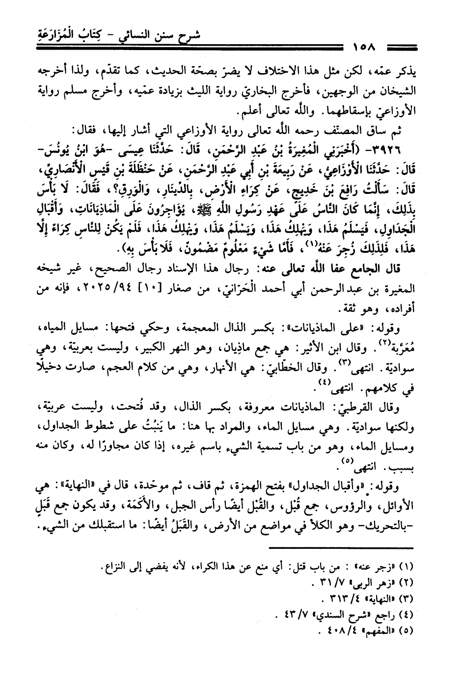 3926 - (أَخْبَرَنِي الْمُغِيرَةُ بْنُ عَبْدِ الرَّحْمَنِ, قَالَ: حَدَّثَنَا عِيسَى -هُوَ ابْنُ يُونُسَ- قَالَ: حَدَّثَنَا الأَوْزَاعِيُّ, عَنْ رَبِيعَةَ بْنِ أَبِي عَبْدِ الرَّحْمَنِ, عَنْ حَنْظَلَةَ بْنِ قَيْسٍ الأَنْصَارِيِّ, قَالَ: سَأَلْتُ رَافِعَ بْنَ خَدِيجٍ, عَنْ كِرَاءِ الأَرْضِ, بِالدِّينَارِ, وَالْوَرِقِ؟ , فَقَالَ: لاَ بَأْسَ بِذَلِكَ, إِنَّمَا كَانَ النَّاسُ عَلَى عَهْدِ رَسُولِ اللَّهِ - صلى اللَّه عليه وسلم -, يُؤَاجِرُونَ عَلَى الْمَاذِيَانَاتِ, وَأَقْبَالِ الْجَدَاوِلِ, فَيَسْلَمُ هَذَا, وَيَهْلِكُ هَذَا, وَيَسْلَمُ هَذَا, وَيَهْلِكُ هَذَا, فَلَمْ يَكُنْ لِلنَّاسِ كِرَاءٌ إِلاَّ هَذَا, فَلِذَلِكَ زُجِرَ عَنْهُ (¬1) , فَأَمَّا شَيْءٌ مَعْلُومٌ مَضْمُونٌ, فَلاَ بَأْسَ بِهِ).