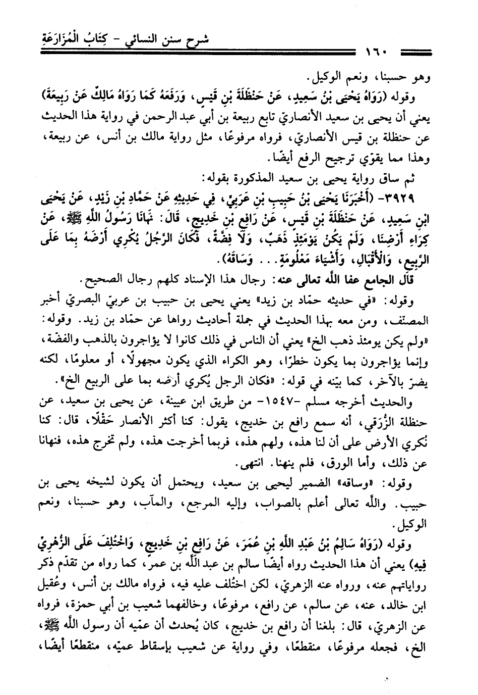 3929 - (أَخْبَرَنَا يَحْيَى بْنُ حَبِيبِ بْنِ عَرَبِيٍّ, فِي حَدِيثِهِ عَنْ حَمَّادِ بْنِ زَيْدٍ, عَنْ يَحْيَى بْنِ سَعِيدٍ, عَنْ حَنْظَلَةَ بْنِ قَيْسٍ, عَنْ رَافِعِ بْنِ خَدِيجٍ, قَالَ: نَهَانَا رَسُولُ اللَّهِ - صلى اللَّه عليه وسلم -, عَنْ كِرَاءِ أَرْضِنَا, وَلَمْ يَكُنْ يَوْمَئِذٍ ذَهَبٌ, وَلاَ فِضَّةٌ, فَكَانَ الرَّجُلُ يُكْرِى أَرْضَهُ بِمَا عَلَى الرَّبِيعِ, وَالأَقْبَالِ, وَأَشْيَاءَ مَعْلُومَةٍ ... وَسَاقَهُ).