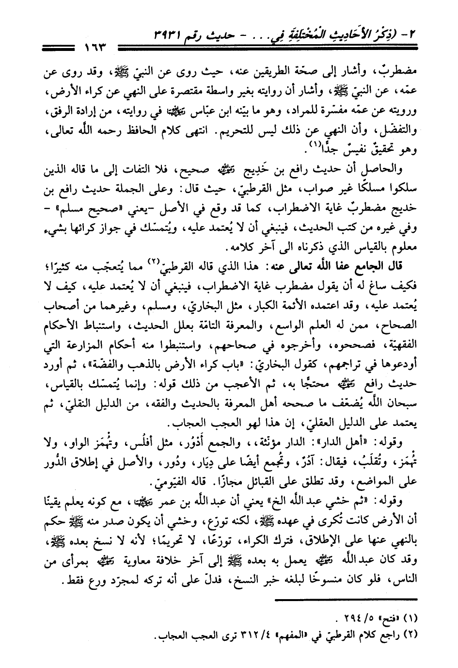 والحاصل أن حديث رافع بن خَدِيج - رضي اللَّه عنه - صحيح، فلا التفات إلى ما قاله الذين سلكوا مسلكًا غير صواب، مثل القرطبيّ، حيث قال: وعلى الجملة حديث رافع بن خديج مضطربٌ غاية الاضطراب، كما قد وقع في الأصل -يعني "صحيح مسلم" - وفي غيره من كتب الحديث، فينبغي أن لا يُعتمد عليه، وُيتمسّك في جواز كرائها بشيء معلوم بالقياس الذي ذكرناه إلى آخر كلامه.