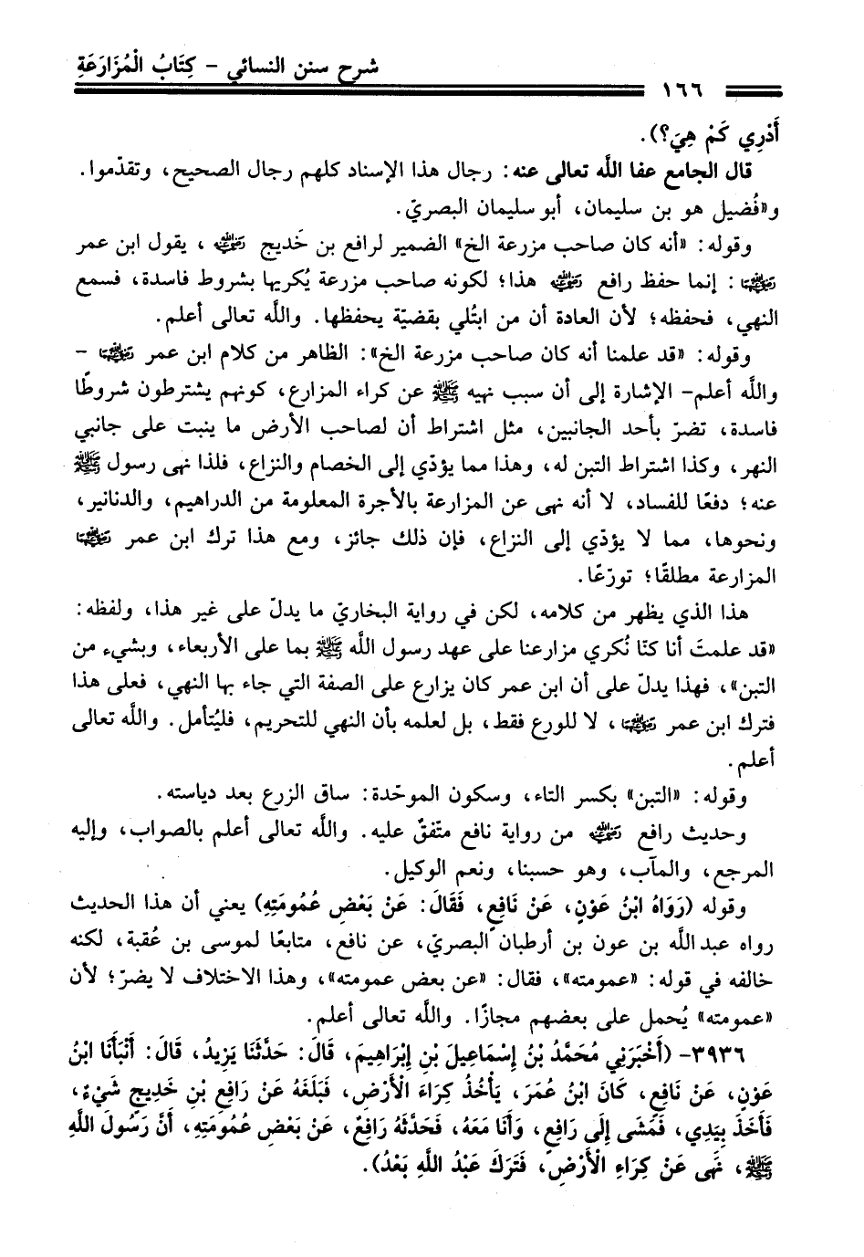 3936 - (أَخْبَرَنِي مُحَمَّدُ بْنُ إِسْمَاعِيلَ بْنِ إِبْرَاهِيمَ, قَالَ: حَدَّثَنَا يَزِيدُ, قَالَ: أَنْبَأَنَا ابْنُ عَوْنٍ, عَنْ نَافِعٍ, كَانَ ابْنُ عُمَرَ, يَأْخُذُ كِرَاءَ الأَرْضِ, فَبَلَغَهُ عَنْ رَافِعِ بْنِ خَدِيجٍ شَيْءٌ, فَأَخَذَ بِيَدِي, فَمَشَى إِلَى رَافِعٍ, وَأَنَا مَعَهُ, فَحَدَّثَهُ رَافِعٌ, عَنْ بَعْضِ عُمُومَتِهِ, أَنَّ رَسُولَ اللَّهِ - صلى اللَّه عليه وسلم -, نَهَى عَنْ كِرَاءِ الأَرْضِ, فَتَرَكَ عَبْدُ اللَّهِ بَعْدُ).