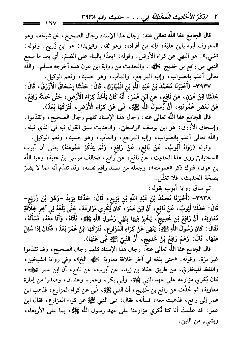 3938 - (أَخْبَرَنَا مُحَمَّدُ بْنُ عَبْدِ اللَّهِ بْنِ بَزِيعٍ, قَالَ: حَدَّثَنَا يَزِيدُ -وَهُوَ ابْنُ زُرَيْعٍ- قَالَ: حَدَّثَنَا أَيُّوبُ, عَنْ نَافِعٍ, أَنَّ ابْنَ عُمَرَ, كَانَ يُكْرِى مَزَارِعَهُ, حَتَّى بَلَغَهُ فِي آخِرِ خِلاَفَةِ مُعَاوِيَةَ, أَنَّ رَافِعَ بْنَ خَدِيجٍ, يُخْبِرُ فِيهَا بِنَهْىِ رَسُولِ اللَّهِ - صلى اللَّه عليه وسلم -, فَأَتَاهُ, وَأَنَا مَعَهُ, فَسَأَلَهُ, فَقَالَ: كَانَ رَسُولُ اللَّهِ - صلى اللَّه عليه وسلم -, يَنْهَى عَنْ كِرَاءِ الْمَزَارِعِ, فَتَرَكَهَا ابْنُ عُمَرَ بَعْدُ, فَكَانَ إِذَا سُئِلَ عَنْهَا, قَالَ: زَعَمَ رَافِعُ بْنُ خَدِيجٍ, أَنَّ النَّبِيَّ - صلى اللَّه عليه وسلم - نَهَى عَنْهَا).