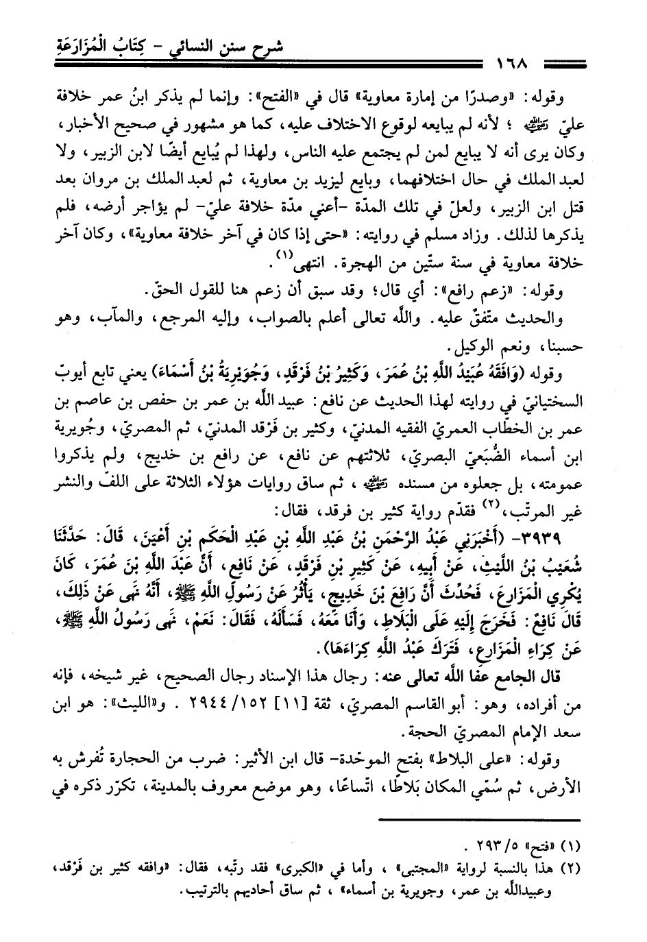 3939 - (أَخْبَرَنِي عَبْدُ الرَّحْمَنِ بْنُ عَبْدِ اللَّهِ بْنِ عَبْدِ الْحَكَمِ بْنِ أَعْيَنَ, قَالَ: حَدَّثَنَا شُعَيْبُ بْنُ اللَّيْثِ, عَنْ أَبِيهِ, عَنْ كَثِيرِ بْنِ فَرْقَدٍ, عَنْ نَافِعٍ, أَنَّ عَبْدَ اللَّهِ بْنَ عُمَرَ, كَانَ يُكْرِي الْمَزَارِعَ, فَحُدِّثَ أَنَّ رَافِعَ بْنَ خَدِيجٍ, يَأْثُرُ عَنْ رَسُولِ اللَّهِ - صلى اللَّه عليه وسلم -, أَنَّهُ نَهَى عَنْ ذَلِكَ. قَالَ نَافِعٌ: فَخَرَجَ إِلَيْهِ عَلَى الْبَلاَطِ, وَأَنَا مَعَهُ, فَسَأَلَهُ, فَقَالَ: نَعَمْ, نَهَى رَسُولُ اللَّهِ - صلى اللَّه عليه وسلم -, عَنْ كِرَاءِ الْمَزَارِعِ, فَتَرَكَ عَبْدُ اللَّهِ كِرَاءَهَا).