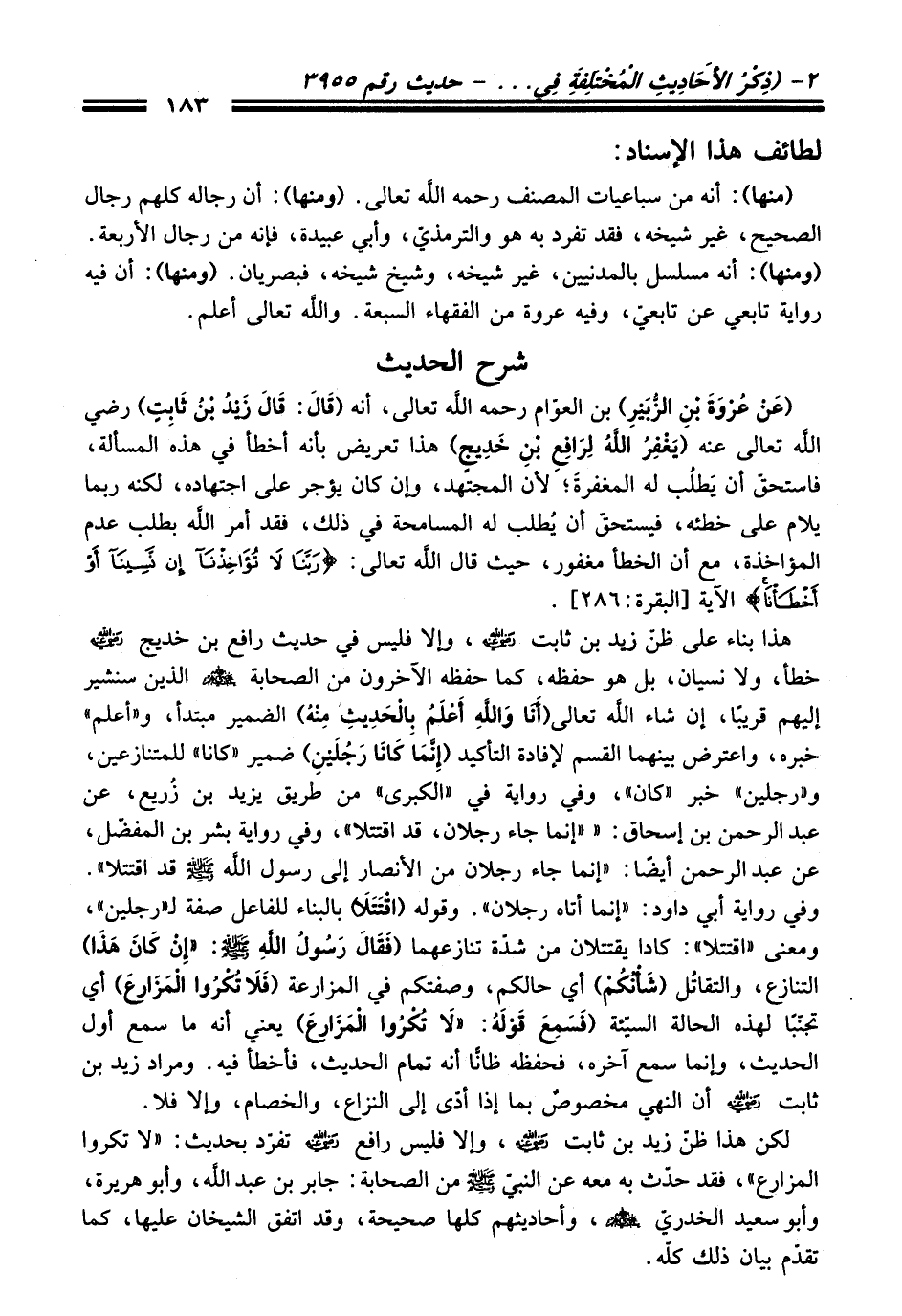 هذا بناء على ظنّ زيد بن ثابت - رضي اللَّه عنه -، وإلا فليس في حديث رافع بن خديج - رضي اللَّه عنه - خطأ، ولا نسيان، بل هو حفظه، كما حفظه الآخرون من الصحابة - رضي اللَّه عنهم - الذين سنشير إليهم قريبًا، إن شاء اللَّه تعالى (أَنَا وَاللَّهِ أَعْلَمُ بِالحَدِيثِ مِنْهُ) الضمير مبتدأ، و"أعلم" خبره، واعترض بينهما القسم لإفادة التأكيد (إِنَّما كَانَا رَجُلَيْنِ) ضمير "كانا" للمتنازعين، و"رجلين" خبر "كان"، وفي رواية في "الكبرى" من طريق يزيد بن زُريع، عن عبد الرحمن بن إسحاق: " "إنما جاء رجلان، قد اقتتلا"، وفي رواية بشر بن المفضّل، عن عبد الرحمن أيضًا: "إنما جاء رجلان من الأنصار إلى رسول اللَّه - صلى اللَّه عليه وسلم - قد اقتتلا". وفي رواية أبي داود: "إنما أتاه رجلان". وقوله (اقْتَتَلَا) بالبناء للفاعل صفة لـ"رجلين"، ومعنى "اقتتلا": كادا يقتتلان من شدّة تنازعهما (فَقَالَ رَسُولُ اللَّهِ - صلى اللَّه عليه وسلم -: "إن كَانَ هَذَا) التنازع، والتقاتُل (شَأْنُكُمْ) أي حالكم، وصفتكم في المزارعة (فَلَا تُكْرُوا المَزَارِعَ) أي تجنّبًا لهذه الحالة السيّئة (فَسَمِعَ قَوْلَهُ: "لَا تُكْرُوا المَزَارِعَ) يعنيب أنه ما سمع أول الحديث، وإنما سمع آخره، فحفظه ظانًّا أنه تمام الحديث، فأخطأ فيه. ومراد زيد بن ثابت - رضي اللَّه عنه - النهي مخصوصٌ بما إذا أدّى إلى النزاع، والخصام، وإلا فلا.