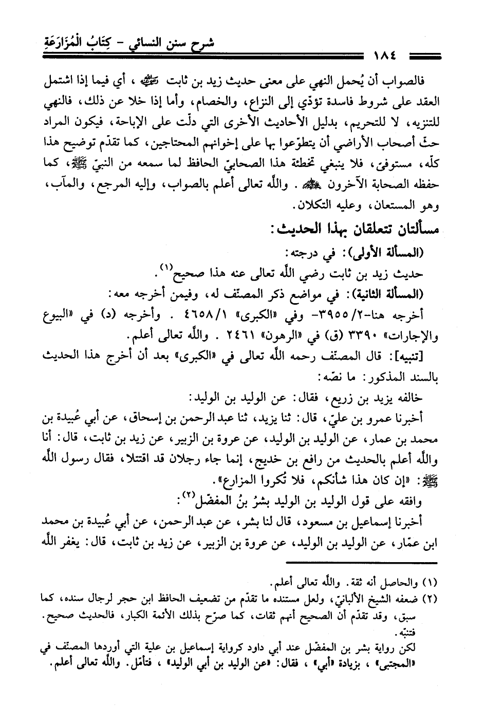 أخبرنا عمرو بن عليّ، قال: ثنا يزيد، ثنا عبد الرحمن بن إسحاق، عن أبي عُبيدة بن محمد بن عمار، عن الوليد بن الوليد، عن عروة بن الزبير، عن زيد بن ثابت، قال: أنا واللَّه أعلم بالحديث من رافع بن خديج، إنما جاء رجلان قد اقتتلا، فقال رسول اللَّه - صلى اللَّه عليه وسلم -: "إن كان هذا شأنكم، فلا تُكروا المزارع".