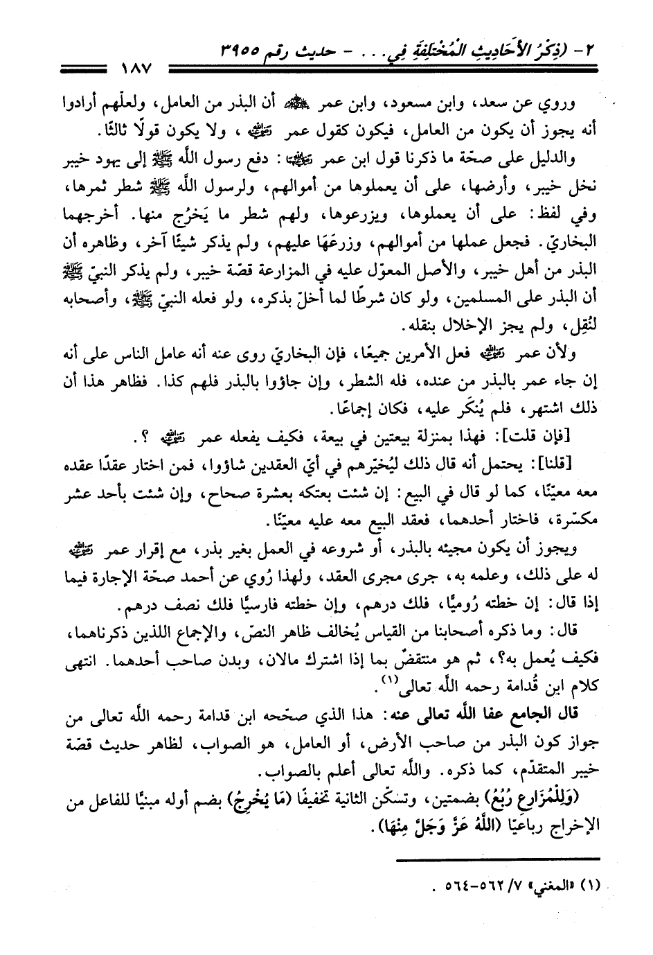 قال الجامع - عفا اللَّه تعالى عنه -: هذا الذي صحّحه ابن قدامة -رحمه اللَّه تعالى- من جواز كون البذر من صاحب الأرض، أو العامل، هو الصواب، لظاهر حديث قصّة خيبر المتقدّم، كما ذكره. واللَّه تعالى أعلم بالصواب.