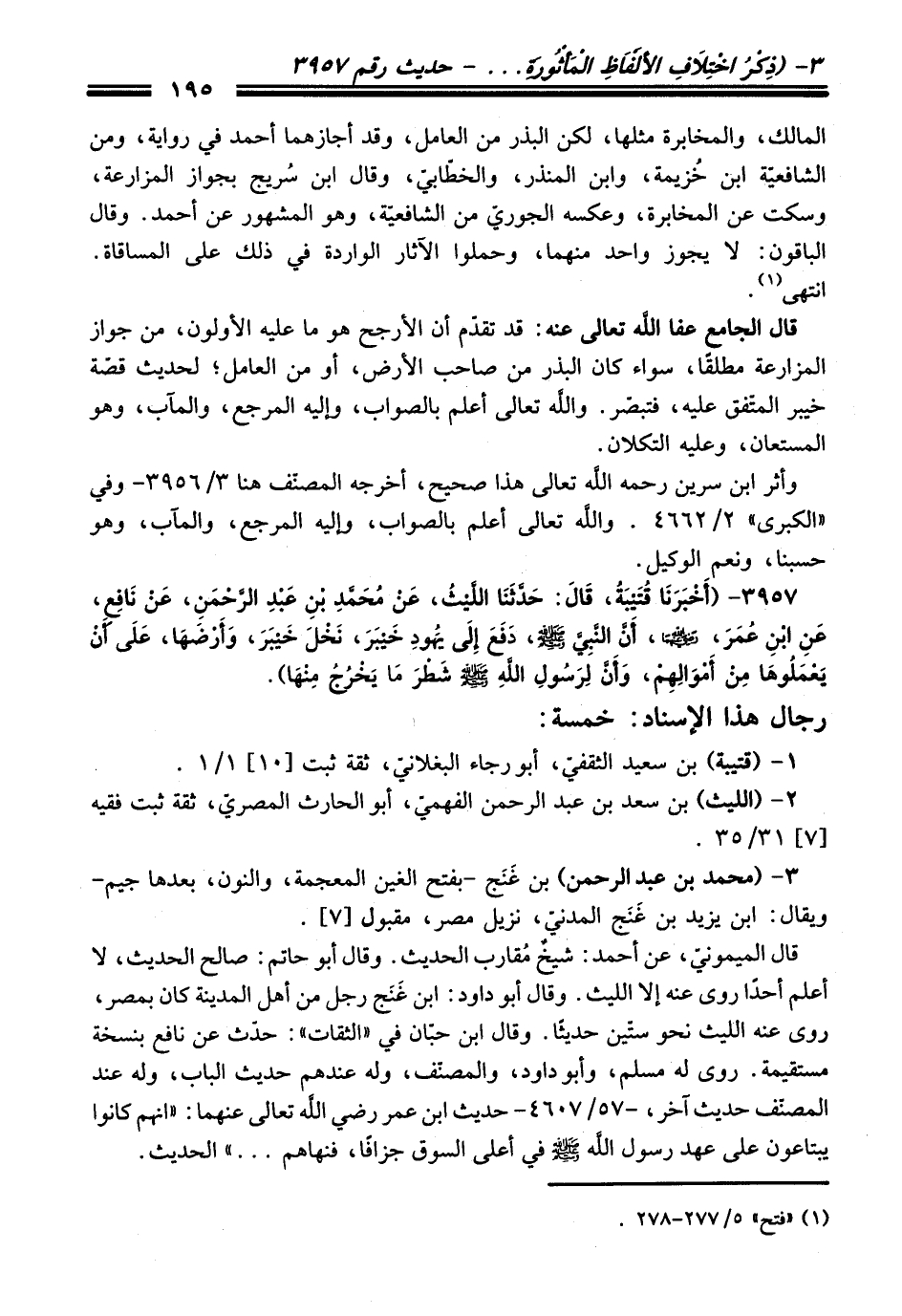 3957 - (أَخْبَرَنَا قُتَيْبَةُ, قَالَ: حَدَّثَنَا اللَّيْثُ, عَنْ مُحَمَّدِ بْنِ عَبْدِ الرَّحْمَنِ, عَنْ نَافِعٍ, عَنِ ابْنِ عُمَرَ, - رضي اللَّه عَنْهُمَا -, أَنَّ النَّبِيَّ - صلى اللَّه عليه وسلم -, دَفَعَ إِلَى يَهُودِ خَيْبَرَ, نَخْلَ خَيْبَرَ, وَأَرْضَهَا, عَلَى أَنْ يَعْمَلُوهَا مِنْ أَمْوَالِهِمْ, وَأَنَّ لِرَسُولِ اللَّهِ - صلى اللَّه عليه وسلم - شَطْرَ مَا يَخْرُجُ مِنْهَا).