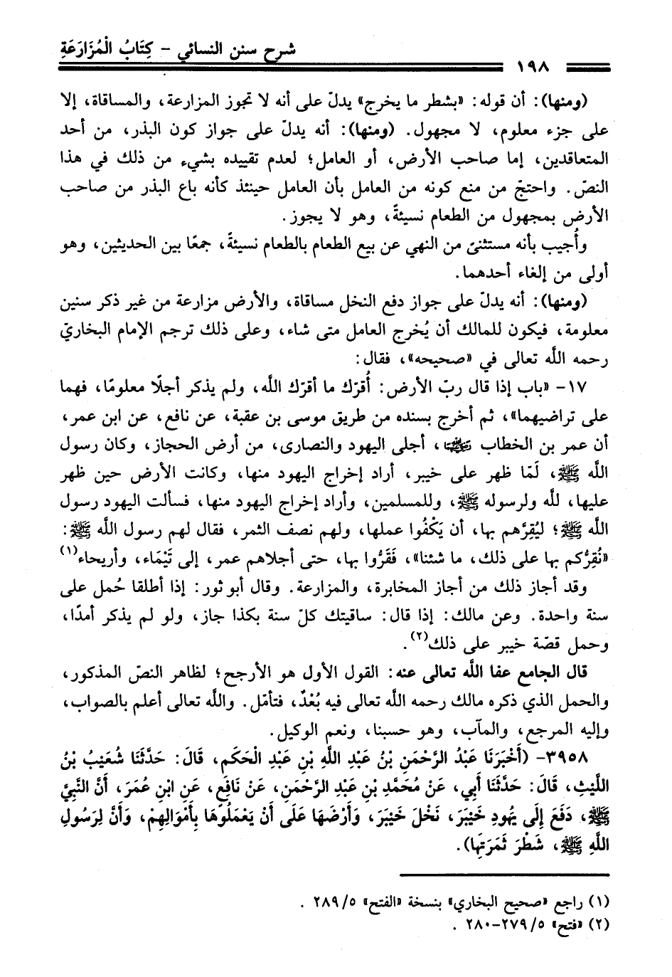 3958 - (أَخْبَرَنَا عَبْدُ الرَّحْمَنِ بْنُ عَبْدِ اللَّهِ بْنِ عَبْدِ الْحَكَمِ, قَالَ: حَدَّثَنَا شُعَيْبُ بْنُ اللَّيْثِ, قَالَ: حَدَّثَنَا أَبِي, عَنْ مُحَمَّدِ بْنِ عَبْدِ الرَّحْمَنِ, عَنْ نَافِعٍ, عَنِ ابْنِ عُمَرَ, أَنَّ النَّبِيَّ - صلى اللَّه عليه وسلم -, دَفَعَ إِلَى يَهُودِ خَيْبَرَ, نَخْلَ خَيْبَرَ, وَأَرْضَهَا عَلَى أَنْ يَعْمَلُوهَا بِأَمْوَالِهِمْ, وَأَنَّ لِرَسُولِ اللَّهِ - صلى اللَّه عليه وسلم -, شَطْرَ ثَمَرَتِهَا).