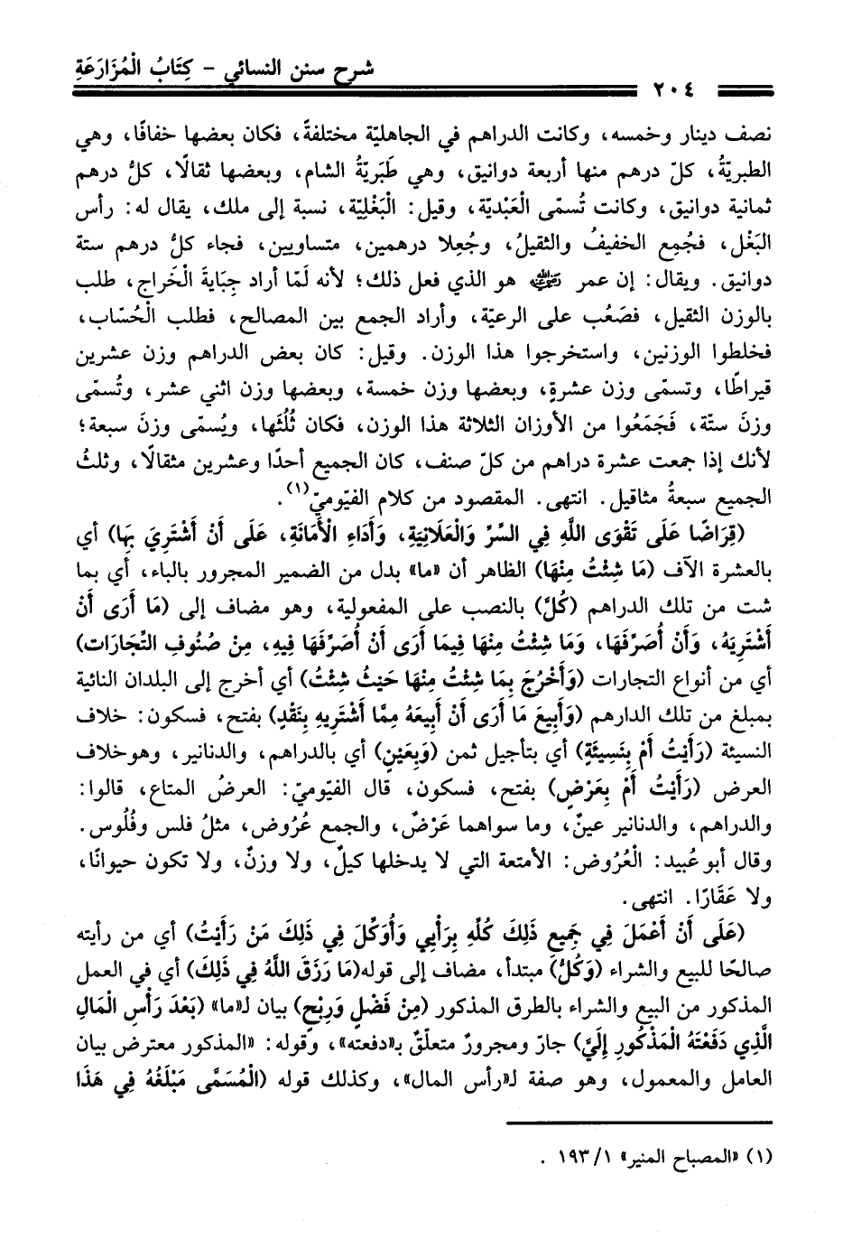 (قِرَاضًا عَلَى تَقْوَى اللَّهِ فِي السِّرِّ وَالعَلَانِيَةِ، وَأَدَاءِ الأمَانَةِ، عَلَى أَنْ أَشْتَرِيَ بِهَا) أي بالعشرة الآف (مَا شِئْتُ مِنْهَا) الظاهر أن "ما" بدل من الضمير المجرور بالباء، أي بما شت من تلك الدراهم (كُلَّ) بالنصب على المفعولية، وهو مضاف إلى (مَا أَرَى أَنْ أَشْتَرِيَهُ، وَأَنْ أُصَرِّفَهَا، وَمَا شِئْتُ مِنْهَا فِيمَا أَرَى أَنْ أُصَرِّفَهَا فِيهِ، مِنْ صُنُوفِ التِّجَارَاتِ) أي من أنواع التجارات (وَأَخْرُجَ بِمَا شِئْتُ مِنْهَا حَيْثُ شِئْتُ) أي أخرج إلى البلدان النائية بمبلغ من تلك الدارهم (وَأَبِيعَ مَا أَرَى أَنْ أَبيعَهُ مِمَّا أَشْتَرِيهِ بِنَقْدٍ) بفتح، فسكون: خلاف النسيئة (رَأَيْتُ أَمْ بنَسِيئَةٍ) أي بتأجيل ثمن (وَبِعَيْنٍ) أي بالدراهم، والدنانير، وهو خلاف العرض (رَأَيْتُ أَمْ بِعَرْضٍ) بفتح، فسكون، قال الفيّوميّ: العرضُ المتاع، قالوا: والدراهم، والدنانير عينٌ، وما سواهما عَرْضٌ، والجمع عُرُوض، مثلُ فلس وفُلُوس. وقال أبو عُبيد: الْعُرُوض: الأمتعة التي لا يدخلها كيلٌ، ولا وزنٌ، ولا تكون حيوانًا، ولا عَقَارًا. انتهى.