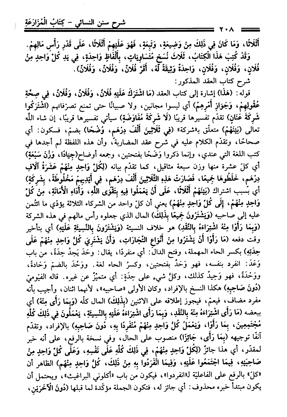 قوله: (هَذَا) إشارة إلى كتاب العقد (مَا اشْتَرَكَ عَلَيْهِ فُلَانٌ، وَفُلَانٌ، وَفُلَانٌ، فِي صِحَّةِ عُقُولِهِم، وَجَوَازِ أَمْرِهِمُ) أي ليسوا مجانين، ولا صبيانًا حتى تمنع تصرّفاتهم (اشْتَرَكُوا شَرِكَةَ عَنَانٍ) تقدّم تفسيرها قريبًا (لَا شَرِكَةَ مُفَاوَضَةٍ) سيأتي تفسيرها قريبًا، إن شاء اللَّه تعالى (بَينَهُم) متعلّق بـ "شركة" (فِي ثَلَاثِينَ أَلْفَ دِرْهَم، وُضْحًا) بضمّ، فسكون: أي صحاحًا، وتقدّم الكلام عليه في شرح عقد المضاربة، وأن هذه اللفظة لم أجدها في كتب اللغة التي عندي، وإنما ذكروا وَضَحًا بفتحتين، وجمعه أوضاح (جِيَادًا، وَزْنَ سَبْعَةٍ) أي كلّ عشرة منها وزن سبعة مثاقيل، كما تقدّم بيانه (لِكُلِّ وَاحِدٍ مِنْهُمْ عَشْرَةُ آلاَفِ دِرْهَمٍ، خَلَطُوهَا جَمِيعًا، فَصَارَتْ هَذِه الثَّلَاِثِينَ أَلْفَ دِرْهَمْ، فِي أَيْدِيِهمْ مَخْلُوطَةً، بِشَرِكةٍ) أي بسبب اشتراك (بَيْنَهُمْ أَثْلَاثًا، عَلَى أَنْ يَعْمَلُوا فِيهِ بِتَقوَى اللَّهِ، وَأَدَاءِ الأَمَانَةِ، مِنْ كُلِّ وَاحِدٍ مِنْهُم، إلَى كُلِّ وَاحِدٍ مِنْهُمْ) يعني أن كلّ واحد من الشركاء الثلاثة يؤدّي ما ائتُمن عليه إلى صاحبيه (وَيَشْتَرُونَ جَمِيعًا بِذَلِكَ) المال الذي جعلوه رأس مالهم في هذه الشركة (وَبِمَا رَأَوْا مِنْهُ اشْتِرَاءَهُ بِالنَّقْدِ) هو خلاف النسية (وَيَشْتَرُونَ بِالنَّسِيئَةِ عَلَيْهِ) أي بتأخير وقت دفعه (مَا رَأَوْا أن يَشتَرُوا من أَنوَاع التجَارَاتِ، وَأَنْ يَشتَرِيَ كُل وَاحِدِ مِنْهُم عَلَى حِدَتِهِ) بكسر الحاء المهملة، وفتح الدالَ: أي منفردًا، يقال: وحَدَ يَحِدُ حِدَةً، من باب وَعَدَ: انفرد بنفسه، فهو وَحَدٌ بفتحتين، وكسرُ الحاء لغة. ووَحُدَ بالضمّ وَحَادةً، ووَحْدَةً، فهو وَحِيدٌ كذلك، وكلُ شيء على حِدَةِ: أي متميِّزٌ عن غيره. قاله الفيّوميّ (دُونَ صَاحِبِهِ) هكذا النسخ بالإفراد، وكان الأولى "صاحبيه", لأنهما اثنان، وأجيب بأنه مفرد مضاف، فيعمّ، فيجوز إطلاقه على الاثنين (بذَلِكَ) المال كلّه (وَبمَا رَأَى مِنْهُ) أي ببعضه (مَا رَأَى اشْتِرَاءَهُ مِنْهُ بالنَّقْدِ، وَبِمَا رَأَى اشتِرَاءَهُ عَلَيْهِ بالنَّسِيئَةِ، يَعْمَلُونَ فِي ذَلِكَ كُلِّهِ مُجْتَمِعِينَ، بمَا رَأَوا، وَيَعْمَلُ كُلُّ وَاحِدِ مِنْهُمْ مُنْفَرِدًا بِهِ، دُونَ صَاحِبهِ) بالإفراد، وتقدّم آنفًا توجيهه (بِمَا رَأَى، جَائِزًا) منصوب على الحال، وفي نسخة بالَرفع، على أنه خبر لمقدّر، أي هذا جائزٌ (لِكُلِّ وَاحِدٍ مِنْهُمْ، فِي ذَلِكَ كُلِّهِ عَلَى نَفْسِهِ، وَعَلَى كُلِّ وَاحِدٍ مِنْ صَاحِبَيهِ، فِيمَا اجتَمَعُوا عَلَيْهِ، وَفِيمَا انْفَرَدُوا بِهِ مِنْ ذَلِكَ، كُل وَاحِدٍ مِنْهُمْ) الظاهر أن "كلّ" بالرفع على الفاعلية لـ"انفردوا"، فيكون من باب "أكلوني البراغيث"، ويحتمل أن يكون مبتدأ خبره محذوف: أي جائز له، فتكون الجملة مؤكّدة لما قبلها (دُونَ الآخَرَيْنِ،