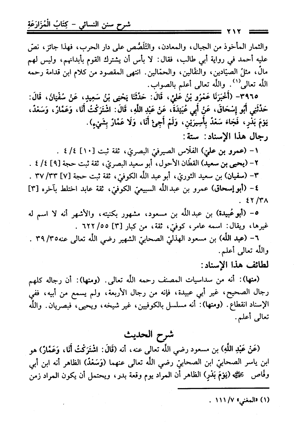 (منها): أنه من سداسيات المصنف -رحمه اللَّه تعالى-. (ومنها): أن رجاله عندهم رجال الصحيح، غير أبي عبيدة، فإنه من رجال الأربعة، ولم يسمع من أبيه، ففي الإسناد انقطاع. (ومنها): أنه مسلسل بالكوفيين، غير شيخه، ويحيى، فبصريان. واللَّه تعالى أعلم.