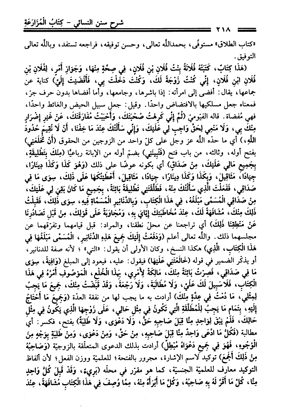 (هَذَا كِتَابٌ، كَتَبَتهُ فُلَانَةُ بِنْتُ فُلَانِ بْنِ فُلَانٍ، فِي صِحَّةٍ مِنْهَا، وَجَوَازِ أَمْرٍ، لِفُلَانِ بْنِ فُلَانِ ابْنِ فُلَانٍ، إِنِّي كُنْتُ زَوْجَةً لَكَ، وَكُنْتَ دَخَلتَ بِي، فَأَفْضَيْتَ إِلَيَّ) كناية عن جماعها، يقال: أفضى إلى امرأته: إذا باشرها، وجامعها، وأما أفضاها بدون حرف جرّ، فمعناه جعل مسلكيها بالافتضاض واحدًا. وقيل: جعل سبيل الحيض والغائط واحدًا، فهي مُفضاة. قاله الفيّوميّ (ثُمَّ إِنِّي كَرِهْتُ صُحْبَتَكَ، وَأَحْبَبْتُ مُفَارَقَتَكَ، عَنْ غَيْرِ إِضْرَارٍ مِنْكَ بِي، وَلَا مَنْعِي لِحَق وَاجِبٍ لِي عَلَيْكَ، وَإنِّي سَأَلْتُكَ عِنْدَمَا خِفْنَا، أَنْ لَا نُقِيمَ حُدُودَ اللَّهِ،) أي ما حدّه اللَّه -عَزَّ وَجَلَّ- على كلّ واحد من الزوجين من الحقوق (أَنْ تَخْلَعَنِي) بفتح أوله، وثالثه، من باب فتح (فَتُبينَنِي) بضمّ أوله من الإبانة رباعيًّا (مِنْكَ بِتَطْلِيقَةٍ، بِجَمِيعِ مَالي عَلَيْكَ، مِنْ صَدَاقٍ) أيَ بكونه عوضًا على ذلك (وَهُوَ كَذَا وَكَذَا دِينَارًا، جِيادًا، مَثَاقِيلَ، وَبكَذَا وَكَذَا دِينَارًا، جيَادًا، مَثَاقِيلَ، أَعْطَيتُكَهَا عَلَى ذَلِكَ، سِوَى مَا فِي صَدَاقِي، فَفَعَلْتَ الَّذِي سَأَلْتُكَ مِنْهُ، فَطَلَّقْتَنِي تَطْلِيقَةً بَائِنَة، بجَمِيعِ مَا كَانَ بَقِيَ لِي عَلَيْكَ، مِنْ صَدَاقِي المُسَمَّى مَبلَغُهُ، فِي هَذَا الكِتَاب، وَبِالدَّنَانِيرِ المُسَمَّاةِ فِيهِ، سِوَى ذَلِكَ، فَقَبِلتُ ذَلِكَ مِنْكَ، مُشَافَهَةً لَكَ، عِنْدَ مُخَاطَبَتِكَ إيَّايَ بِهِ، وَمُجَاوَبَةٌ عَلَى قَوْلِكَ، مِنْ قَبْلِ تَصَادُرِنَا عَنْ مَنطِقِنَا ذَلِكَ) أي تراجعنا عن محلّ نطقَنا، والمراد: قبل قيامهما وتفرّقهما عن مجلسهما ذلك. واللَّه تعالى أعلم (وَدَفَعْتُ إِلَيْكَ جمَيعَ هَذِهِ الدَّنَانِيرِ، الْمُسَمَّى مَبلَغُهَا فِي هَذَا الْكِتَاب، الَّذِي) هكذا النسخ، وكان الأولى أن يقول: "التي"؛ لأنه صفة للدنانير، أو يذكر الضَمير في قوله (خَالَعْتَنِي عَلَيْهَا) فيقول: عليه، فيعود إلى المبلغ (وَافِيةٌ، سِوَى مَا في صدَاقي، فَصِرْتُ بَائِنَة مِنْكَ، مَالِكَةٌ لِأَمْرِي، بِهَذَا الخُلعِ، الْمَوْصُوفِ أَمْرُهُ فِي هَذَا الكِتَابِ، فَلَا سَبِيلَ لَكَ عَلَيَّ، وَلَا مُطَالَبَةَ، وَلَا رَجعَةَ، وَقَد قَبَضْتُ مِنْكَ، جَمِيعَ مَا يَجِبُ لِمِثليَ، مَا دُمْتُ فِي عِدَّةٍ مِنْكَ) أرادت به ما يجب لها من نفقة العدّة (وَجَمِيعَ مَا أَحْتَاجُ إِلَيْهِ، بِتَمَام مَا يَجِبُ لِلمُطَلَّقَةِ الَّتِى تكُونُ فِي مِثلِ حَالي، عَلَى زَوْجِهَا الَّذِي يَكُونُ فِي مِثْلِ حَالِكَ، فَلمْ يبْقَ لِوَاحِدٍ مِنَّا قِبَلَ صَاحِبِهِ حَقٌّ، وَلَا دَعْوَى، وَلَا طَلِبَةٌ) بفتح، فكسر: أيَ مطالبة (فَكُلُّ مَا ادَّعَى وَاحِدٌ مِنَّا قْبَل صَاحِبِهِ، مِنْ حَقٍّ، وَمِنْ دَعْوى، وَمِنْ طَلبَة بِوَجهٍ مِنَ الوُجُوهِ، فَهُوَ فِي جَمِيع دَعوَاهُ مُبْطِلٌ) أرادت بذلك الدعوى المتعلقة بالزوجية (وَصَاحِبُهُ مِنْ ذَلِكَ أَجْمَعَ) توكيدَ لاسم الإشارة، مجرور بالفتحة؛ للعلميّة ووزن الفعل؛ لأن ألفاظ التوكيد معارف للعلميّة الجنسيّة، كما هو مقرّر في محلّه (بَرِيءٌ، وَقَدْ قَبِلَ كُلُّ وَاحِدٍ منَّا، كُلَّ مَا أَقرَّ لَهُ بِهِ صَاحِبُهُ، وَكُلَّ مَا أَبْرَأَهُ مِنْهُ، مِمَّا وُصِفَ فِي هَذَا الكِتَابِ مُشَافَهَةً، عِنْدَ