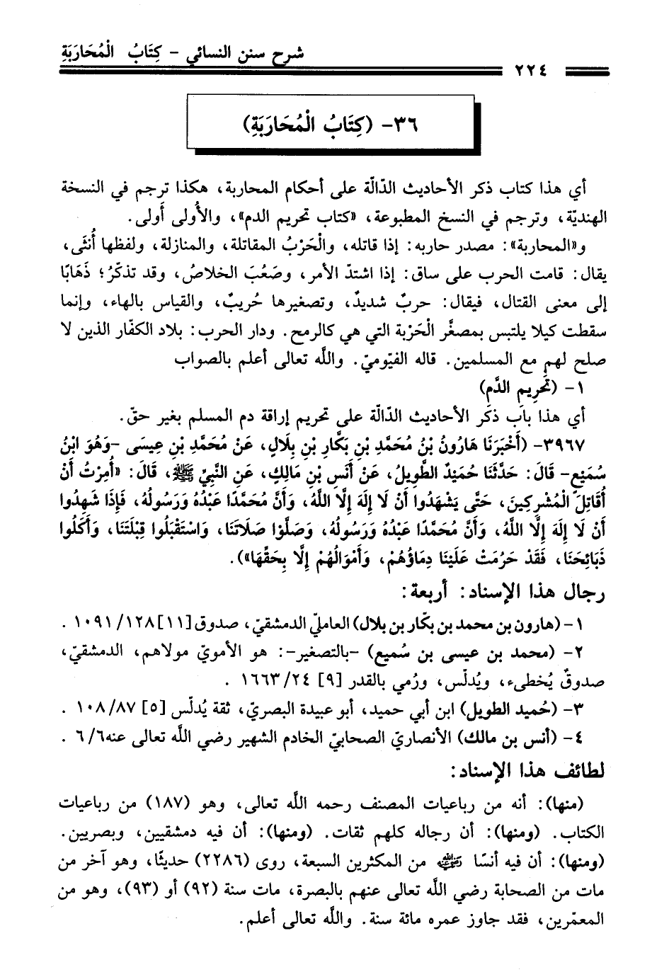 3967 - (أَخْبَرَنَا هَارُونُ بْنُ مُحَمَّدِ بْنِ بَكَّارِ بْنِ بِلاَلٍ, عَنْ مُحَمَّدِ بْنِ عِيسَى -وَهُوَ ابْنُ سُمَيْعٍ- قَالَ: حَدَّثَنَا حُمَيْدٌ الطَّوِيلُ, عَنْ أَنَسِ بْنِ مَالِكٍ, عَنِ النَّبِيِّ - صلى اللَّه عليه وسلم -, قَالَ: «أُمِرْتُ أَنْ أُقَاتِلَ الْمُشْرِكِينَ, حَتَّى يَشْهَدُوا أَنْ لاَ إِلَهَ إِلاَّ اللَّهُ, وَأَنَّ مُحَمَّدًا عَبْدُهُ وَرَسُولُهُ, فَإِذَا شَهِدُوا أَنْ لاَ إِلَهَ إِلاَّ اللَّهُ, وَأَنَّ مُحَمَّدًا عَبْدُهُ وَرَسُولُهُ, وَصَلَّوْا صَلاَتَنَا, وَاسْتَقْبَلُوا قِبْلَتَنَا, وَأَكَلُوا ذَبَائِحَنَا, فَقَدْ حَرُمَتْ عَلَيْنَا دِمَاؤُهُمْ, وَأَمْوَالُهُمْ إِلاَّ بِحَقِّهَا»).