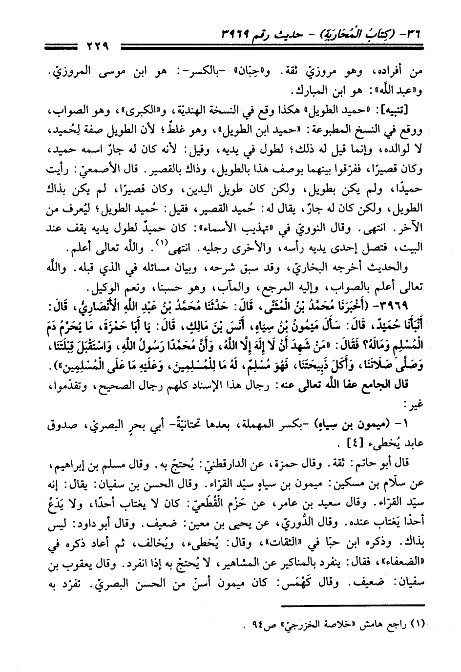 3969 - (أَخْبَرَنَا مُحَمَّدُ بْنُ الْمُثَنَّى, قَالَ: حَدَّثَنَا مُحَمَّدُ بْنُ عَبْدِ اللَّهِ الأَنْصَارِيُّ, قَالَ: أَنْبَأَنَا حُمَيْدٌ, قَالَ: سَأَلَ مَيْمُونُ بْنُ سِيَاهٍ, أَنَسَ بْنَ مَالِكٍ, قَالَ: يَا أَبَا حَمْزَةَ, مَا يُحَرِّمُ دَمَ الْمُسْلِمِ وَمَالَهُ؟ فَقَالَ: مَنْ شَهِدَ أَنْ لاَ إِلَهَ إِلاَّ اللَّهُ, وَأَنَّ مُحَمَّدًا رَسُولُ اللَّهِ, وَاسْتَقْبَلَ قِبْلَتَنَا, وَصَلَّى صَلاَتَنَا, وَأَكَلَ ذَبِيحَتَنَا, فَهُوَ مُسْلِمٌ, لَهُ مَا لِلْمُسْلِمِينَ, وَعَلَيْهِ مَا عَلَى الْمُسْلِمِينَ).
