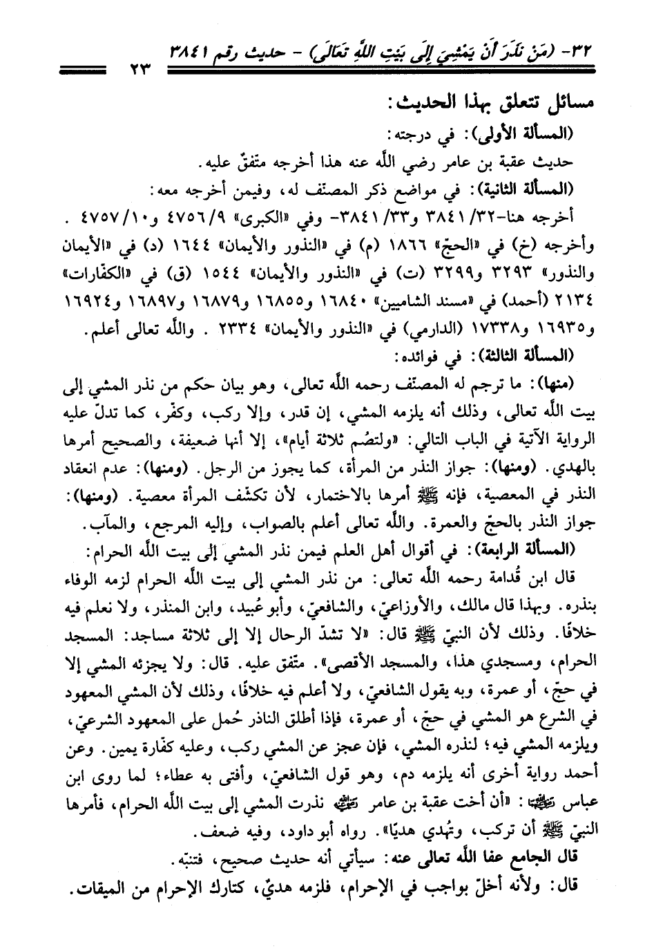 قال ابن قُدامة -رحمه اللَّه تعالى-: من نذر المشي إلى بيت اللَّه الحرام لزمه الوفاء بنذره. وبهذا قال مالك، والأوزاعيّ، والشافعيّ، وأبو عُبيد، وابن المنذر، ولا نعلم فيه خلافًا. وذلك لأن النبيّ - صلى اللَّه عليه وسلم - قال: ولا تشدّ الرحال إلا إلى ثلاثة مساجد: المسجد الحرام، ومسجدي هذا، والمسجد الأقصى". متّفقٌ عليه. قال: ولا يجزئه المشي إلا في حجّ، أو عمرة، وبه يقول الشافعيّ، ولا أعلم فيه خلافًا، وذلك لأن المشي المعهود في الشرع هو المشي في حجّ، أو عمرة، فإذا أطلق الناذر حُمل على المعهود الشرعيّ، ويلزمه المشي فيه؛ لنذره المشي، فإن عجز عن المشي ركب، وعليه كفّارة يمين. وعن أحمد رواية أخرى أنه يلزمه دم، وهو قول الشافعيّ، وأفتى به عطاء؛ لما روى ابن عبّاس - رضي اللَّه عنه -: "أن أخت عقبة بن عامر - رضي اللَّه عنه - نذرت المشي إلى بيت اللَّه الحرام، فأمرها النبيّ - صلى اللَّه عليه وسلم - تركب، وتُهدي هديًا". رواه أبو داود، وفيه ضعف.