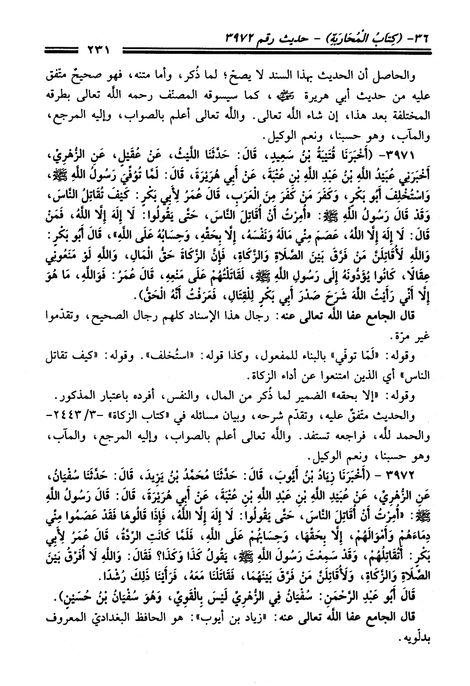3972 - (أَخْبَرَنَا زِيَادُ بْنُ أَيُّوبَ, قَالَ: حَدَّثَنَا مُحَمَّدُ بْنُ يَزِيدَ, قَالَ: حَدَّثَنَا سُفْيَانُ, عَنِ الزُّهْرِيِّ, عَنْ عُبَيْدِ اللَّهِ بْنِ عَبْدِ اللَّهِ بْنِ عُتْبَةَ, عَنْ أَبِي هُرَيْرَةَ, قَالَ: قَالَ رَسُولُ اللَّهِ - صلى اللَّه عليه وسلم -: «أُمِرْتُ أَنْ أُقَاتِلَ النَّاسَ, حَتَّى يَقُولُوا: لاَ إِلَهَ إِلاَّ اللَّهُ, فَإِذَا قَالُوهَا فَقَدْ عَصَمُوا مِنِّي دِمَاءَهُمْ وَأَمْوَالَهُمْ, إِلاَّ بِحَقِّهَا, وَحِسَابُهُمْ عَلَى اللَّهِ, فَلَمَّا كَانَتِ الرِّدَّةُ, قَالَ عُمَرُ لأَبِى بَكْرٍ: أَتُقَاتِلُهُمْ, وَقَدْ سَمِعْتَ رَسُولَ اللَّهِ - صلى اللَّه عليه وسلم -, يَقُولُ كَذَا وَكَذَا؟ فَقَالَ: وَاللَّهِ لاَ أُفَرِّقُ بَيْنَ الصَّلاَةِ وَالزَّكَاةِ, وَلأُقَاتِلَنَّ مَنْ فَرَّقَ بَيْنَهُمَا, فَقَاتَلْنَا مَعَهُ, فَرَأَيْنَا ذَلِكَ رُشْدًا.
