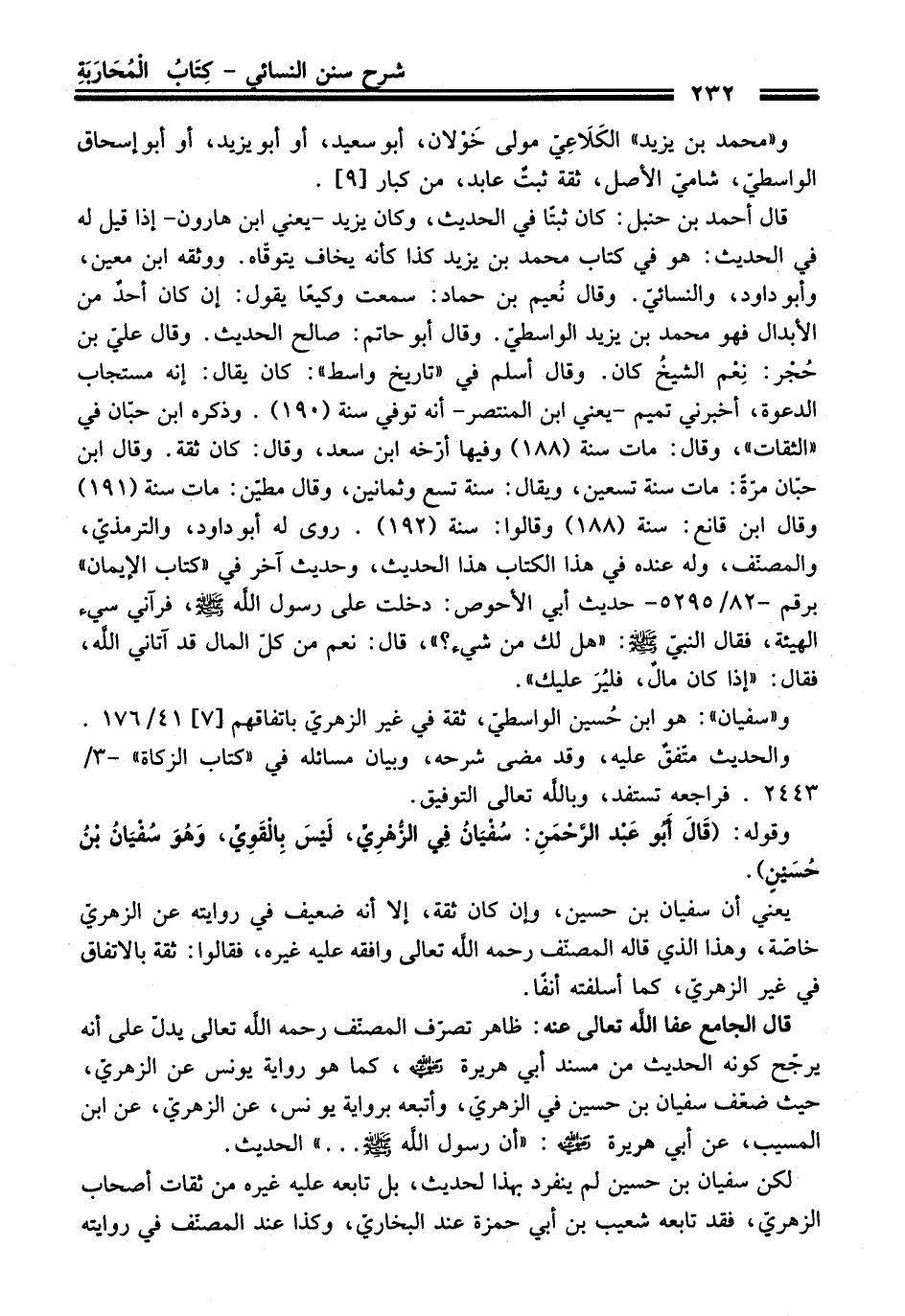 قال أحمد بن حنبل: كان ثبتًا في الحديث، وكان يزيد -يعني ابن هارون- إذا قيل له في الحديث: هو في كتاب محمد بن يزيد كذا كأنه يخاف يتوقّاه. ووثقه ابن معين، وأبو داود، والنسائيّ. وقال نُعيم بن حماد: سمعت وكيعًا يقول: إن كان أحدٌ من الأبدال فهو محمد بن يزيد الواسطيّ. وقال أبو حاتم: صالح الحديث. وقال عليّ بن حُجْر: نِعْم الشيخُ كان. وقال أسلم في "تاريخ واسط": كان يقال: إنه مستجاب الدعوة، أخبرني تميم -يعني ابن المنتصر- أنه توفي سنة (190). وذكره ابن حبّان في "الثقات"، وقال: مات سنة (188) وفيها أرّخه ابن سعد، وقال: كان ثقة. وقال ابن حبّان مرّة: مات سنة تسعين، ويقال: سنة تسع وثمانين، وقال مطين: مات سنة (191) وقال ابن قانع: سنة (188) وقالوا: سنة (192). روى له أبو داود، والترمذيّ، والمصنّف، وله عنده في هذا الكتاب هذا الحديث، وحديث آخر في "كتاب الإيمان" برقم -82/ 5295 - حديث أبي الأحوص: دخلت على رسول اللَّه - صلى اللَّه عليه وسلم -، فرآني سيء الهيئة، فقال النبيّ - صلى اللَّه عليه وسلم -: "هل لك من شيء؟ "، قال: نعم من كلّ المال قد آتاني اللَّه، فقال: "إذا كان مالٌ، فليُرَ عليك".