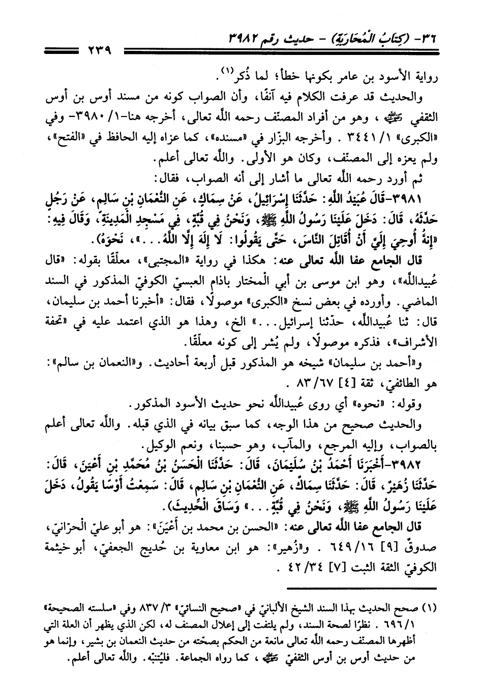 3981 - قَالَ عُبَيْدُ اللَّهِ: حَدَّثَنَا إِسْرَائِيلُ, عَنْ سِمَاكٍ, عَنِ النُّعْمَانِ بْنِ سَالِمٍ, عَنْ رَجُلٍ حَدَّثَهُ, قَالَ: دَخَلَ عَلَيْنَا رَسُولُ اللَّهِ - صلى اللَّه عليه وسلم -, وَنَحْنُ فِي قُبَّةٍ, فِي مَسْجِدِ الْمَدِينَةِ, وَقَالَ فِيهِ: «إِنَّهُ أُوحِىَ إِلَيَّ أَنْ أُقَاتِلَ النَّاسَ, حَتَّى يَقُولُوا: لاَ إِلَهَ إِلاَّ اللَّهُ ...» , نَحْوَهُ).