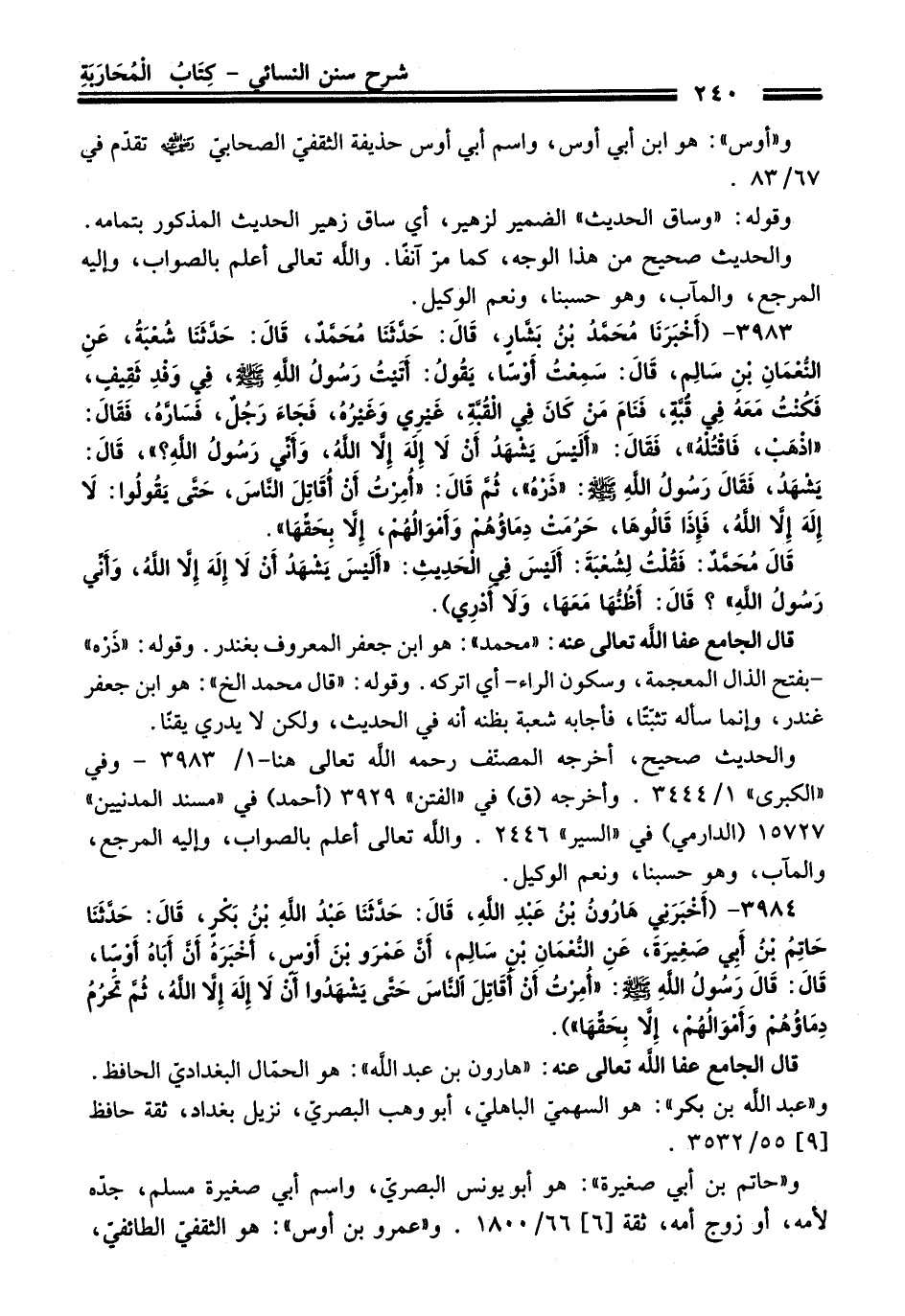 3984 - (أَخْبَرَنِي هَارُونُ بْنُ عَبْدِ اللَّهِ, قَالَ: حَدَّثَنَا عَبْدُ اللَّهِ بْنُ بَكْرٍ, قَالَ: حَدَّثَنَا حَاتِمُ بْنُ أَبِي صَغِيرَةَ, عَنِ النُّعْمَانِ بْنِ سَالِمٍ, أَنَّ عَمْرَو بْنَ أَوْسٍ, أَخْبَرَهُ أَنَّ أَبَاهُ أَوْسًا, قَالَ: قَالَ رَسُولُ اللَّهِ - صلى اللَّه عليه وسلم -: «أُمِرْتُ أَنْ أُقَاتِلَ النَّاسَ حَتَّى يَشْهَدُوا أَنْ لاَ إِلَهَ إِلاَّ اللَّهُ, ثُمَّ تَحْرُمُ دِمَاؤُهُمْ وَأَمْوَالُهُمْ, إِلاَّ بِحَقِّهَا»).