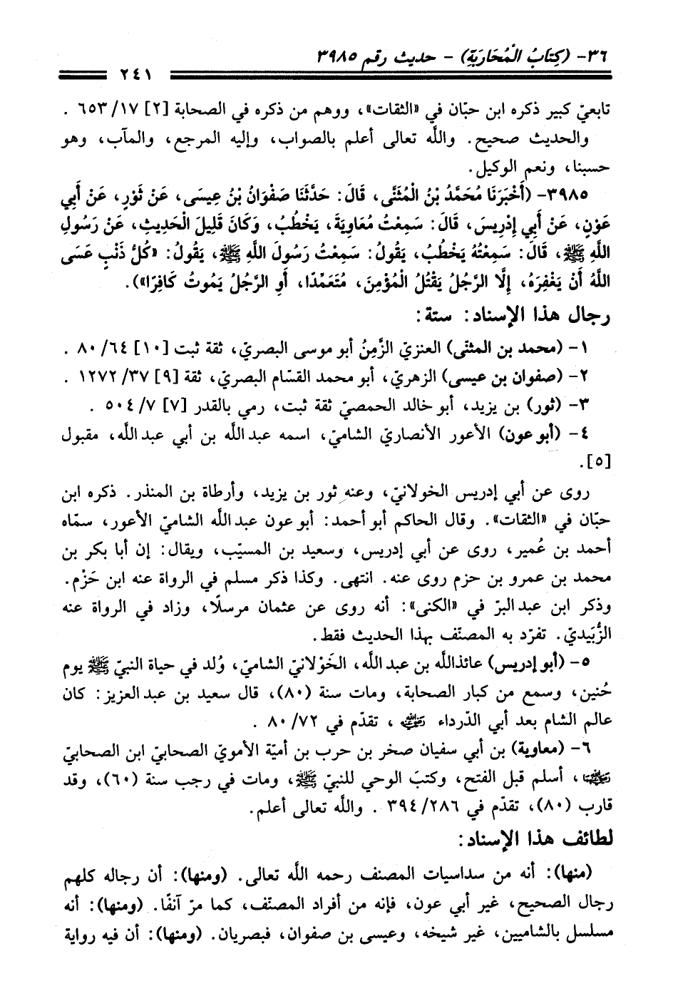 3985 - (أَخْبَرَنَا مُحَمَّدُ بْنُ الْمُثَنَّى, قَالَ: حَدَّثَنَا صَفْوَانُ بْنُ عِيسَى, عَنْ ثَوْرٍ, عَنْ أَبِي عَوْنٍ, عَنْ أَبِي إِدْرِيسَ, قَالَ: سَمِعْتُ مُعَاوِيَةَ, يَخْطُبُ, وَكَانَ قَلِيلَ الْحَدِيثِ, عَنْ رَسُولِ اللَّهِ - صلى اللَّه عليه وسلم -, قَالَ: سَمِعْتُهُ يَخْطُبُ, يَقُولُ: سَمِعْتُ رَسُولَ اللَّهِ - صلى اللَّه عليه وسلم -, يَقُولُ: «كُلُّ ذَنْبٍ عَسَى اللَّهُ أَنْ يَغْفِرَهُ, إِلاَّ الرَّجُلُ يَقْتُلُ الْمُؤْمِنَ, مُتَعَمِّدًا, أَوِ الرَّجُلُ يَمُوتُ كَافِرًا»).