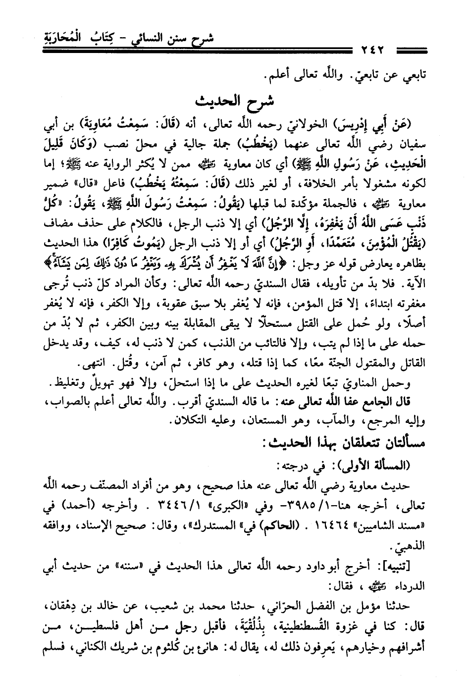 (عَنْ أَبِي إِدْرِيسَ) الخولانيّ -رحمه اللَّه تعالى-، أنه (قَالَ: سَمِعْتُ مُعَاوِيَةَ) بن أبي سفيان - رضي اللَّه تعالى عنهما - (يَخْطُبُ) جملة حالية في محلّ نصب (وَكَانَ قَلِيلَ الْحَدِيثِ، عَنْ رَسُولِ اللَّهِ - صلى اللَّه عليه وسلم -) أي كان معاوية - رضي اللَّه عنه - ممن لا يُكثر الرواية عنه - صلى اللَّه عليه وسلم -؛ إما لكونه مشغولا بأمر الخلافة، أو لغير ذلك (قَالَ: سَمِعتُهُ يَخْطُبُ) فاعل "قال" ضمير معاوية - رضي اللَّه عنه -، فالجملة مؤكّدة لما قبلها (يَقُولُ: سَمِعتُ رَسُولَ اللَّهِ - صلى اللَّه عليه وسلم -، يَقُولُ: "كُلُّ ذَنْبٍ عَسَى اللَّهُ أَنْ يَغْفِرَهُ، إِلَّا الرَّجُلُ) أي إلا ذنب الرجل، فالكلام على حذف مضاف (يَقْتُلُ الْمُؤمِنَ، مُتَعَمِّدًا، أَوِ الرَّجُلُ) أي أو إلا ذنب الرجل (يَمُوتُ كَافِرًا) هذا الحديث بظاهره يعارض قوله -عَزَّ وَجَلَّ-: {إِنَّ اللَّهَ لَا يَغْفِرُ أَنْ يُشْرَكَ بِهِ وَيَغْفِرُ مَا دُونَ ذَلِكَ لِمَنْ يَشَاءُ} الآية. فلا بدّ من تأويله، فقال السنديّ -رحمه اللَّه تعالى-: وكأن المراد كلّ ذنب تُرجى مغفرته ابتداءً، إلا قتل المؤمن، فإنه لا يُغفر بلا سبق عقوبة, وإلا الكفر، فإنه لا يُغفر أصلاً، ولو حُمل على القتل مستحلًّا لا يبقى المقابلة بينه وبين الكفر، ثم لا بُد من حمله على ما إذا لم يتب، وإلا فالتائب من الذنب، كمن لا ذنب له، كيف، وقد يدخل القاتل والمقتول الجنّة معًا، كما إذا قتله، وهو كافر، ثم آمن، وقُتل. انتهى.