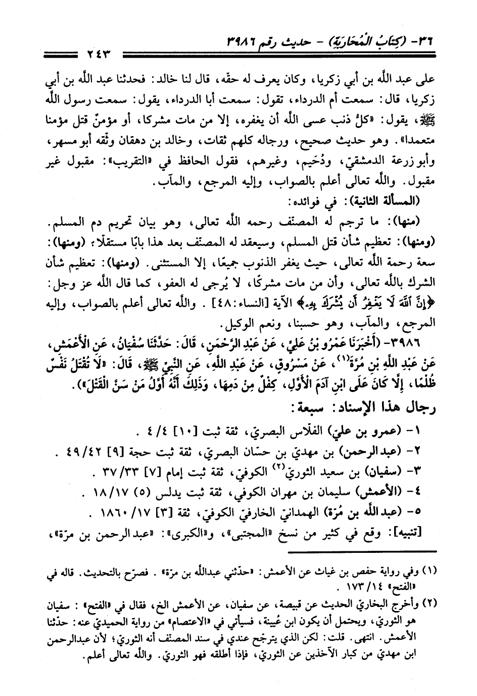 3986 - (أَخْبَرَنَا عَمْرُو بْنُ عَلِيٍّ, عَنْ عَبْدِ الرَّحْمَنِ, قَالَ: حَدَّثَنَا سُفْيَانُ, عَنِ الأَعْمَشِ, عَنْ عَبْدِ اللَّهِ بْنِ مُرَّةَ (¬1) , عَنْ مَسْرُوقٍ, عَنْ عَبْدِ اللَّهِ, عَنِ النَّبِيِّ - صلى اللَّه عليه وسلم -, قَالَ: «لاَ تُقْتَلُ نَفْسٌ ظُلْمًا, إِلاَّ كَانَ عَلَى ابْنِ آدَمَ الأَوَّلِ, كِفْلٌ مِنْ دَمِهَا, وَذَلِكَ أَنَّهُ أَوَّلُ مَنْ سَنَّ الْقَتْلَ»).