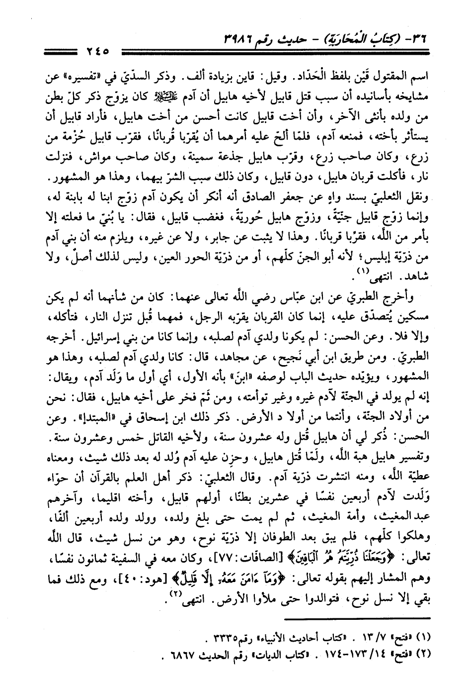 (¬2) "فتح" 14/ 173 - 174. "كتاب الديات" رقم الحديث 6867.