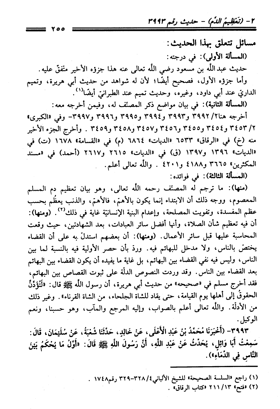 3993 - (أَخْبَرَنَا مُحَمَّدُ بْنُ عَبْدِ الأَعْلَى, عَنْ خَالِدٍ حَدَّثَنَا شُعْبَةُ, عَنْ سُلَيْمَانَ, قَالَ: سَمِعْتُ أَبَا وَائِلٍ, يُحَدِّثُ عَنْ عَبْدِ اللَّهِ, أَنَّ رَسُولَ اللَّهِ - صلى اللَّه عليه وسلم - قَالَ: «أَوَّلُ مَا يُحْكَمُ بَيْنَ النَّاسِ فِي الدِّمَاءِ»).